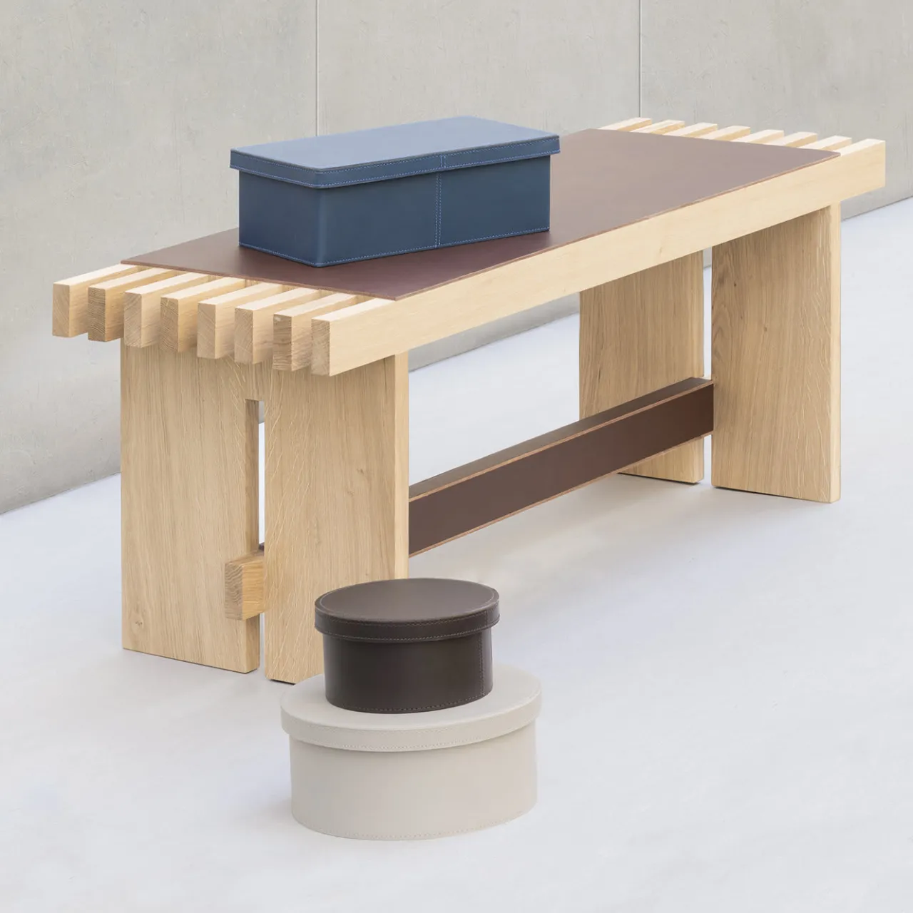 Ecco un altro pezzo della collezione Yuga. Questa bella panca è realizzata in legno di rovere e sormontata da una seduta in cuoio, mentre i dettagli squisiti arricchiscono l’articolo e la preziosità dei suoi materiali. La pelle di selleria utilizzata per la seduta è conciata al vegetale e ha una speciale finitura impermeabile.