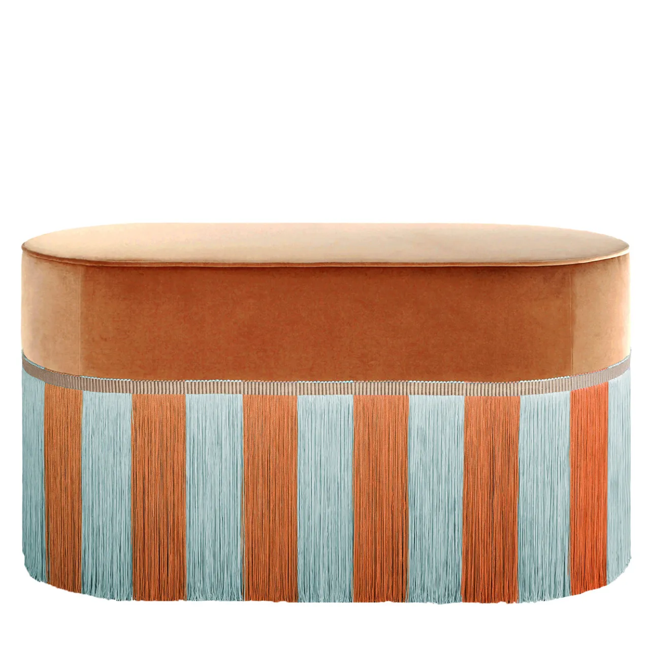 Una audace reinterpretazione della collezione di panchine signature con fringes a righe. Inizialmente progettata con righe bianche e monocolore, la versione aggiornata introduce combinazioni di frange bicolore, migliorando la profondità e il dinamismo visivo. In questa edizione, il morbido velluto arancione è abbinato a frange azzurre e arancioni, risultando in un pezzo d’accento sofisticato e moderno, ideale per interni di grande impatto. Design personalizzabile, oltre 80 colori di frange disponibili. Si prega di contattare il Concierge per ulteriori informazioni. Ogni pezzo su misura è timbrato sul fondo della fodera del pouf e firmato, numerato e datato personalmente dal designer.