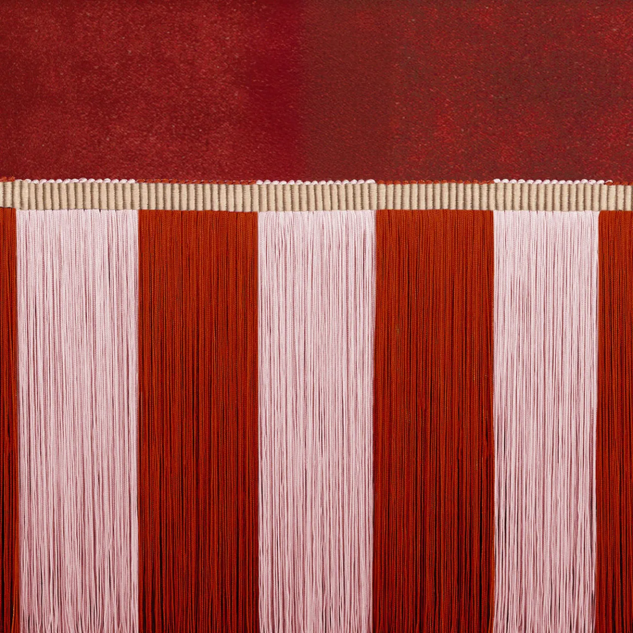 Una audace reinterpretazione della collezione di panchine firmate con frange a righe. Inizialmente progettata con strisce bianche e a un solo colore, la versione aggiornata introduce combinazioni di frange a due colori, aumentando profondità e dinamismo visivo. In questa edizione, il morbido velluto rosso è abbinato a frange rosa e rosse, risultando in un pezzo d’accento sofisticato e moderno, ideale per interni di grande impatto. Design personalizzabile, oltre 80 colori di frange disponibili. Si prega di contattare il Concierge per ulteriori informazioni. Ogni pezzo su misura è timbrato sul fondo della fodera del pouf e firmato, numerato e datato personalmente dal designer.