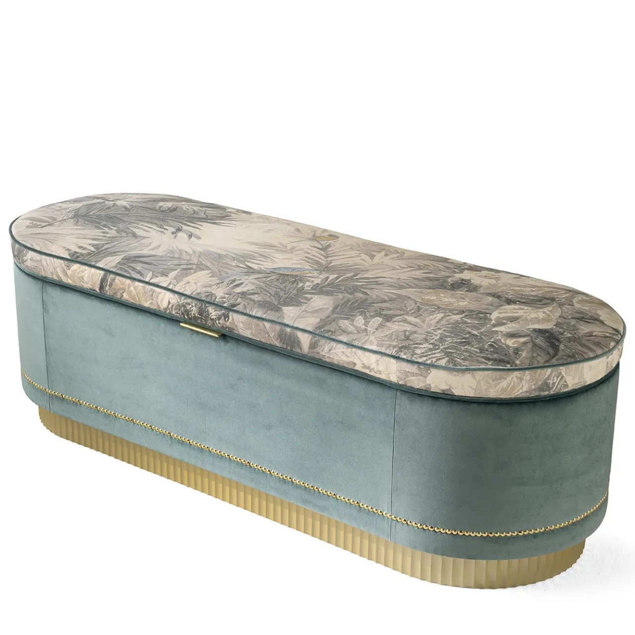 Elemento d’arredo decorativo dalle suggestioni esotiche, il pouf Meriam è presentato con rivestimento della seduta in tessuto stampato Selva e impreziosito da borchie dorate e da una base scanalata laccata oro. In questa nuova versione, il pouf è anche un prezioso elemento contenitore che può essere aperto sollevando il cuscino di seduta. Pouf Meriam con contenitore apribile sollevando il cuscino di seduta. Struttura in legno multistrato e schiuma poliuretanica espansiva ad alta densità a spessore variabile, rivestita in poliestere resinato.