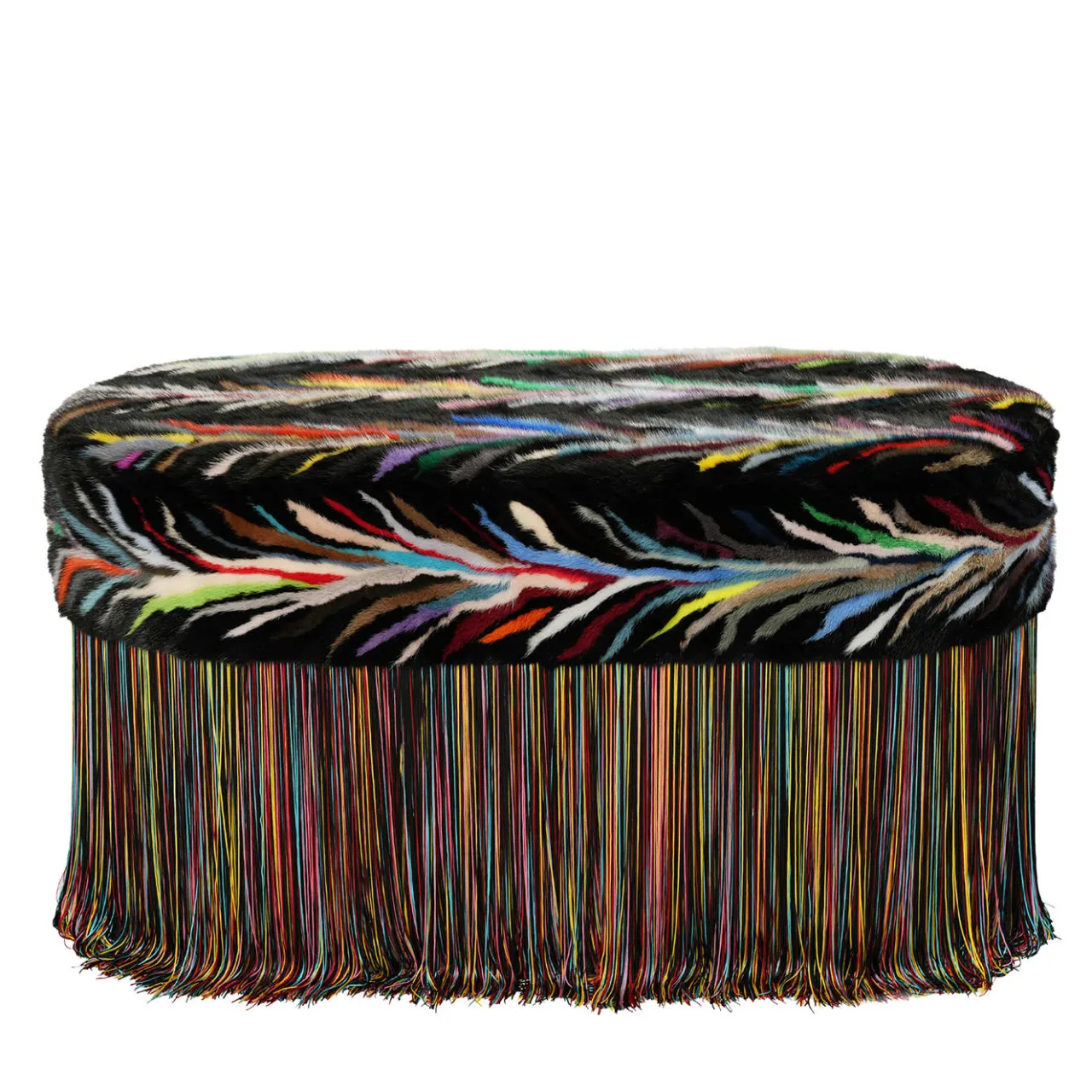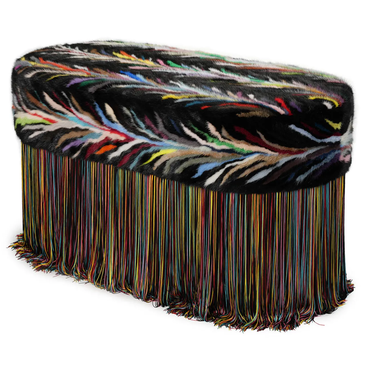 Questa lussuosa panca in pelliccia di visone nera presenta uno splendido patchwork multicolore di inserti in pelliccia di visone fiammata, che offre una seduta calda e morbidissima. Le vivaci frange multicolore aggiungono un tocco audace, mentre l’elegante colore nero della base ne esalta l’eleganza. Realizzato con una robusta struttura e gambe in legno di faggio, questo pezzo è una vera e propria dichiarazione di artigianalità e design. Edizione limitata di 3 pezzi.