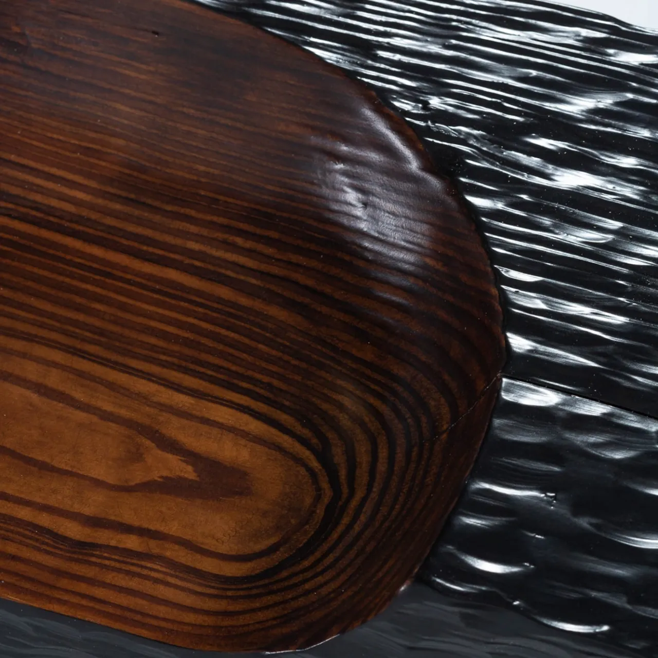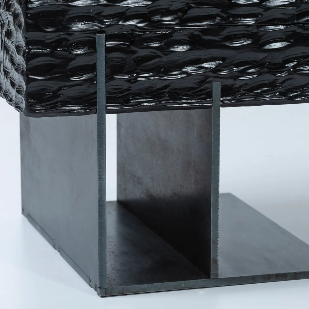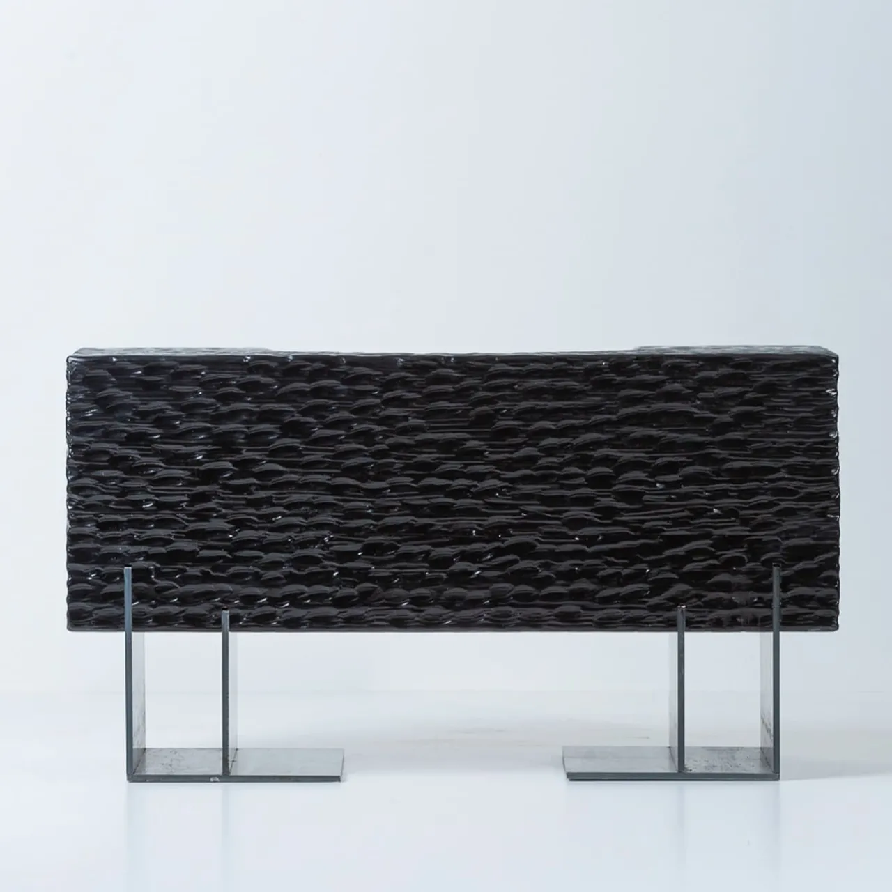 Questa panca di grande effetto cattura il fascino innato delle forme organiche unito alla maestria impareggiabile di abili artigiani. Sollevata su una base scultorea in ferro rifinito all’ossido nero, l’imponente struttura in abete Douglas sfoggia un corpo a forma di parallelepipedo ampiamente decorato con dettagli intagliati a mano, la cui texture è enfatizzata da una tinta nera lucida. Il sedile a ricciolo è staccato dalla struttura e messo in mostra nella sua finitura naturale.