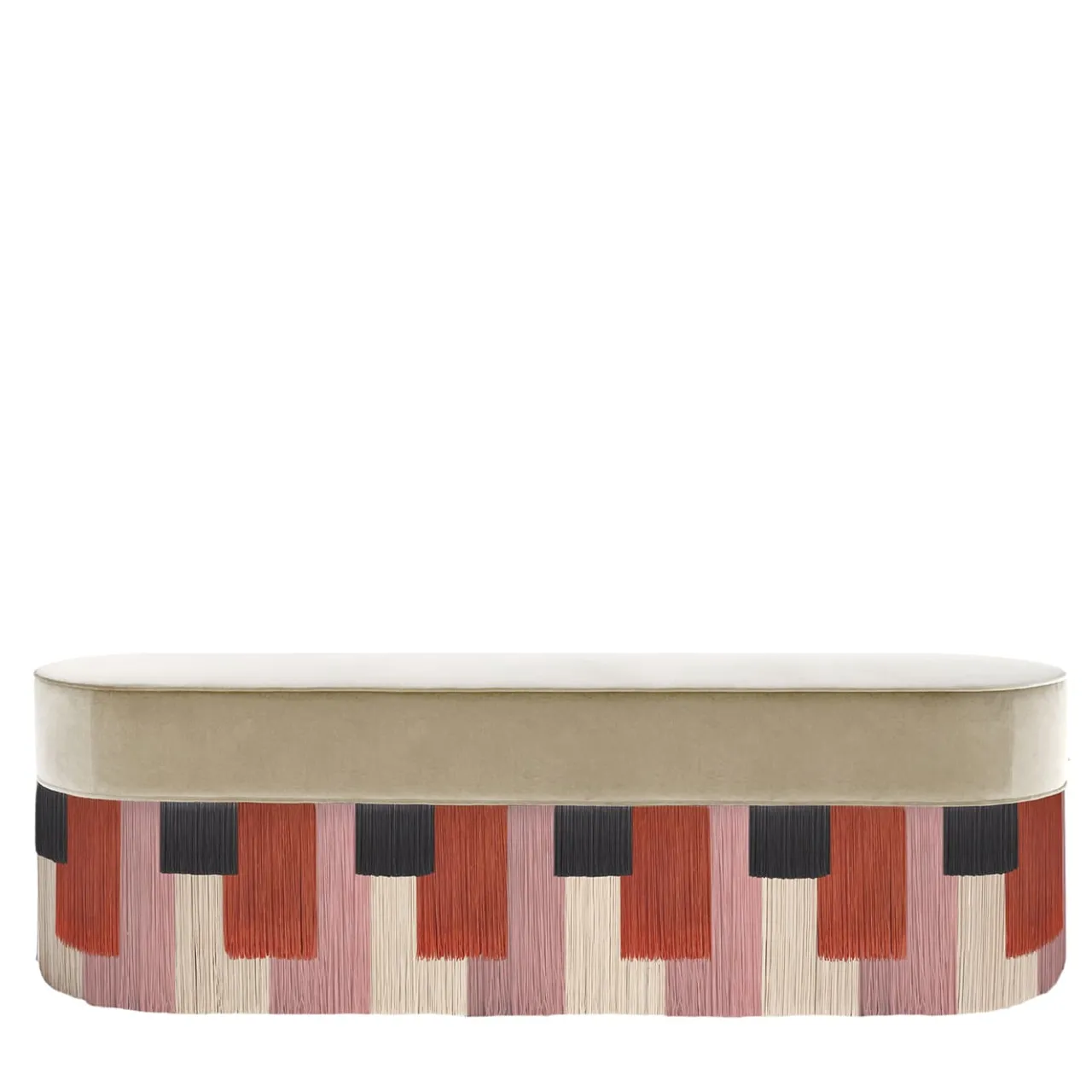 Qualità sartoriale impareggiabile e spirito glamour convivono in questa panca esclusiva. Contraddistinta da un trionfo di frange di viscosa assortite per dimensioni e tonalità che creano un accattivante motivo geometrico, il suo design eccentrico è infine ammorbidito dalla seduta tranquilla e raffinata rivestita in velluto beige. Contattare il Concierge per conoscere le opzioni di personalizzazione e i prezzi. Ogni pezzo su misura è impresso sul fondo della fodera del pouf e firmato, numerato e datato personalmente dal designer.