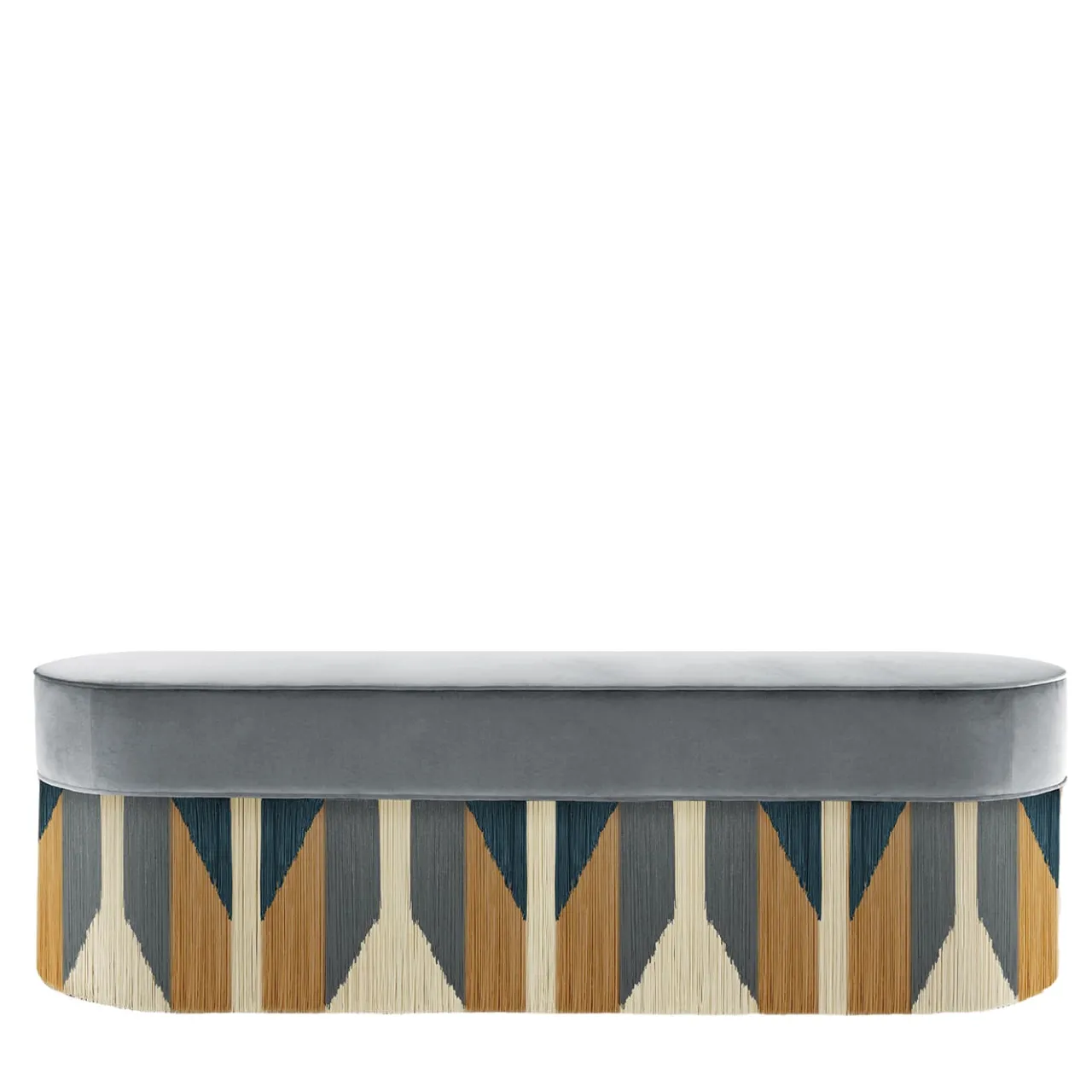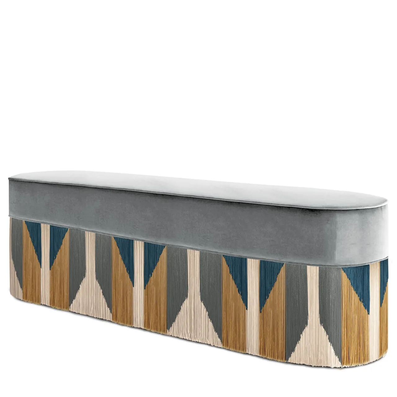 Un’ampia seduta curvilinea preziosamente rivestita in velluto grigio è l’elemento che suggella questa eccentrica panca con un pizzico di tranquilla eleganza. Contraddistinto da una serie di frange che si riuniscono in un dinamico motivo in stile tribale, il pezzo è abilmente realizzato a mano e può essere completamente personalizzato su richiesta al Concierge per un risultato su misura della personalità dello spazio che andrà a completare. Ogni pezzo su misura è impresso sul fondo della fodera del pouf e firmato, numerato e datato personalmente dal designer.