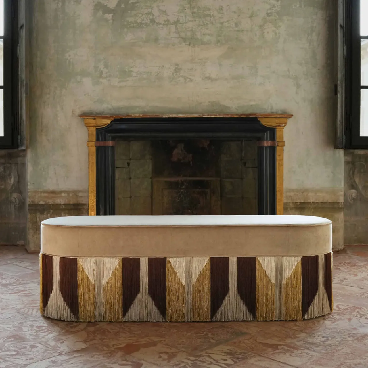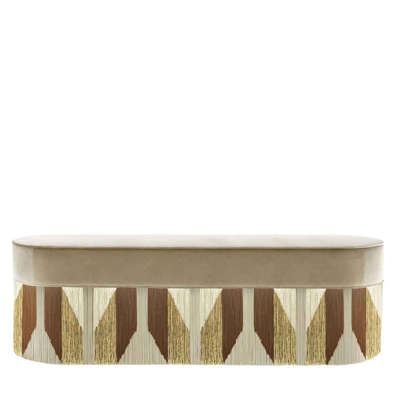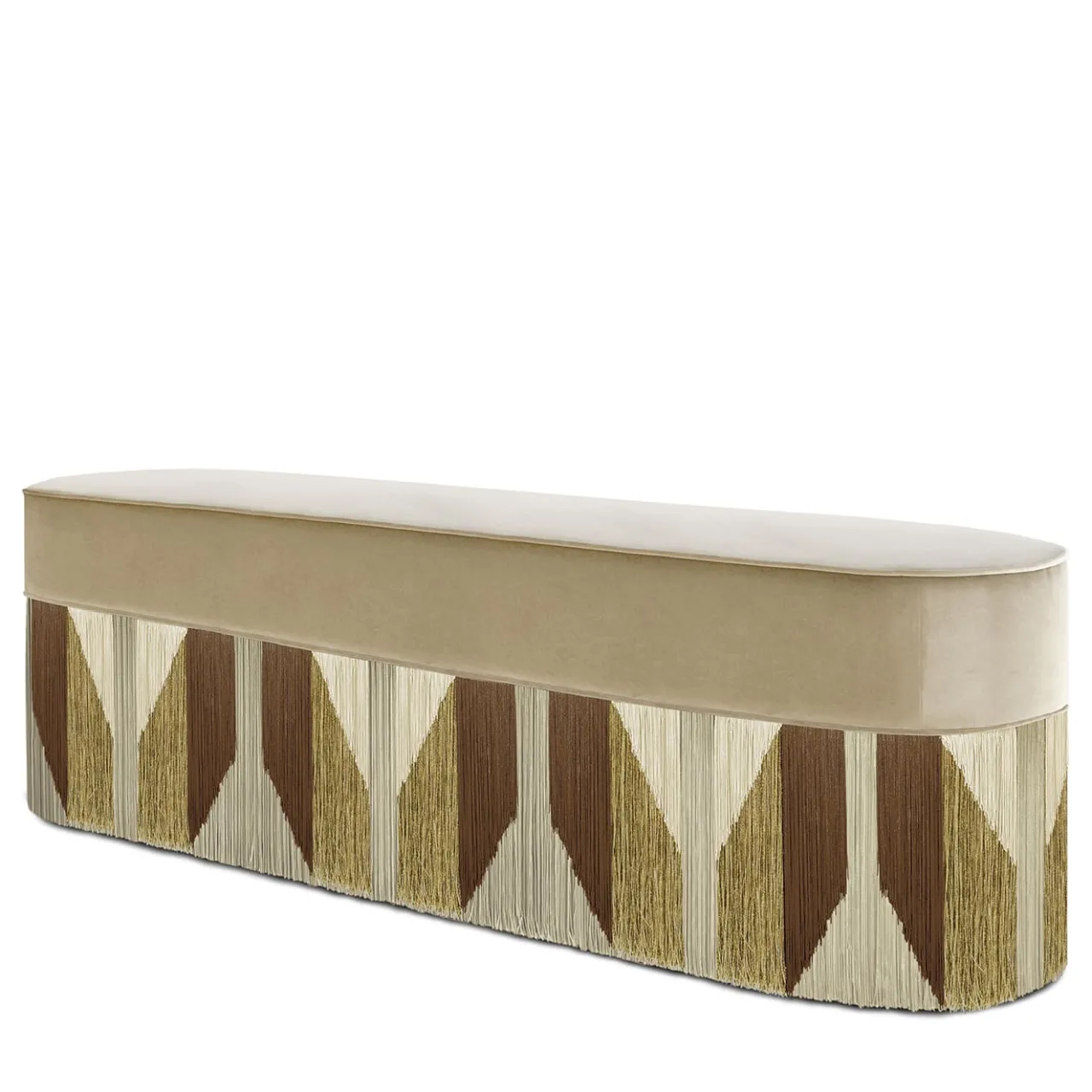 Eccellenza sartoriale ed eleganza cromatica si fondono in questa superba panca artigianale. Caratterizzata da una robusta anima in faggio, si distingue per la serie di frange in viscosa nei toni della terra, disposte con cura per creare un intrigante motivo di ispirazione tribale. Il comfort perfetto è garantito dall’ampio sedile curvilineo rivestito in pregiato velluto beige. Contattare il Concierge per le opzioni di personalizzazione. Ogni pezzo su misura è impresso sul fondo della fodera del pouf e firmato, numerato e datato personalmente dal designer.
