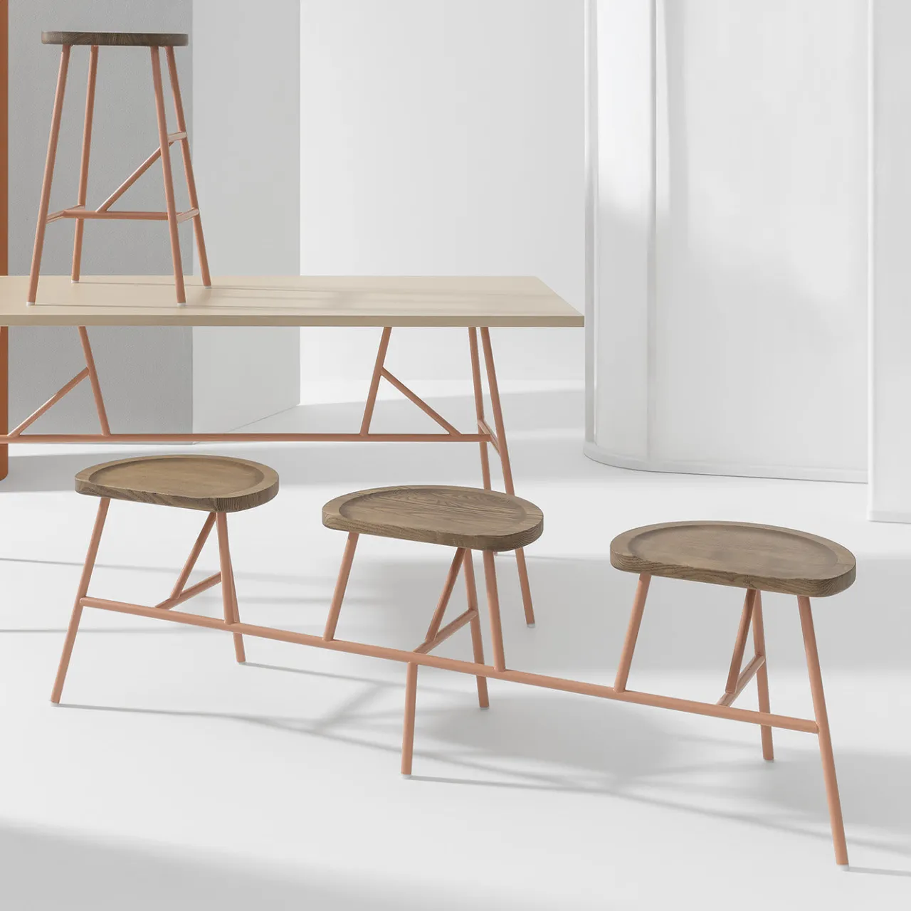 Questo esclusivo progetto di Emilio Nanni, che trasmette un senso di leggerezza e fascino senza sforzo, trae ispirazione dallo sgabello e lo reinterpreta in molteplici versioni che si integrano con gli arredi commerciali e residenziali. La struttura cilindrica in acciaio laccato in tonalità tabacco chiaro sostiene con grazia le tre sedute separate, ciascuna di forma semicircolare e realizzate in frassino tinto in marrone mogano.