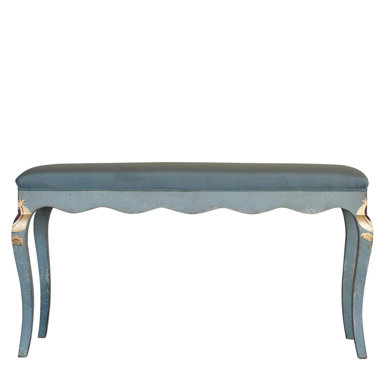 Interamente realizzata e dipinta a mano nel classico stile veneziano, questa elegante panca in legno è un pezzo d’accento senza tempo per offrire posti a sedere supplementari in una camera da letto o in un soggiorno. La base rettangolare ha un bordo ondulato che sfocia con grazia nelle quattro gambe a sciabola dall’estetica architettonica. L’elegante colore ceruleo ha una finitura anticata e i quattro angoli sono decorati a mano con il disegno di un melograno reso nelle calde tonalità dell’oro e del rosso. La seduta viene fornita rivestita in tessuto bianco (ceruleo nell’immagine), ma la personalizzazione è offerta in qualsiasi tessuto dal cliente.