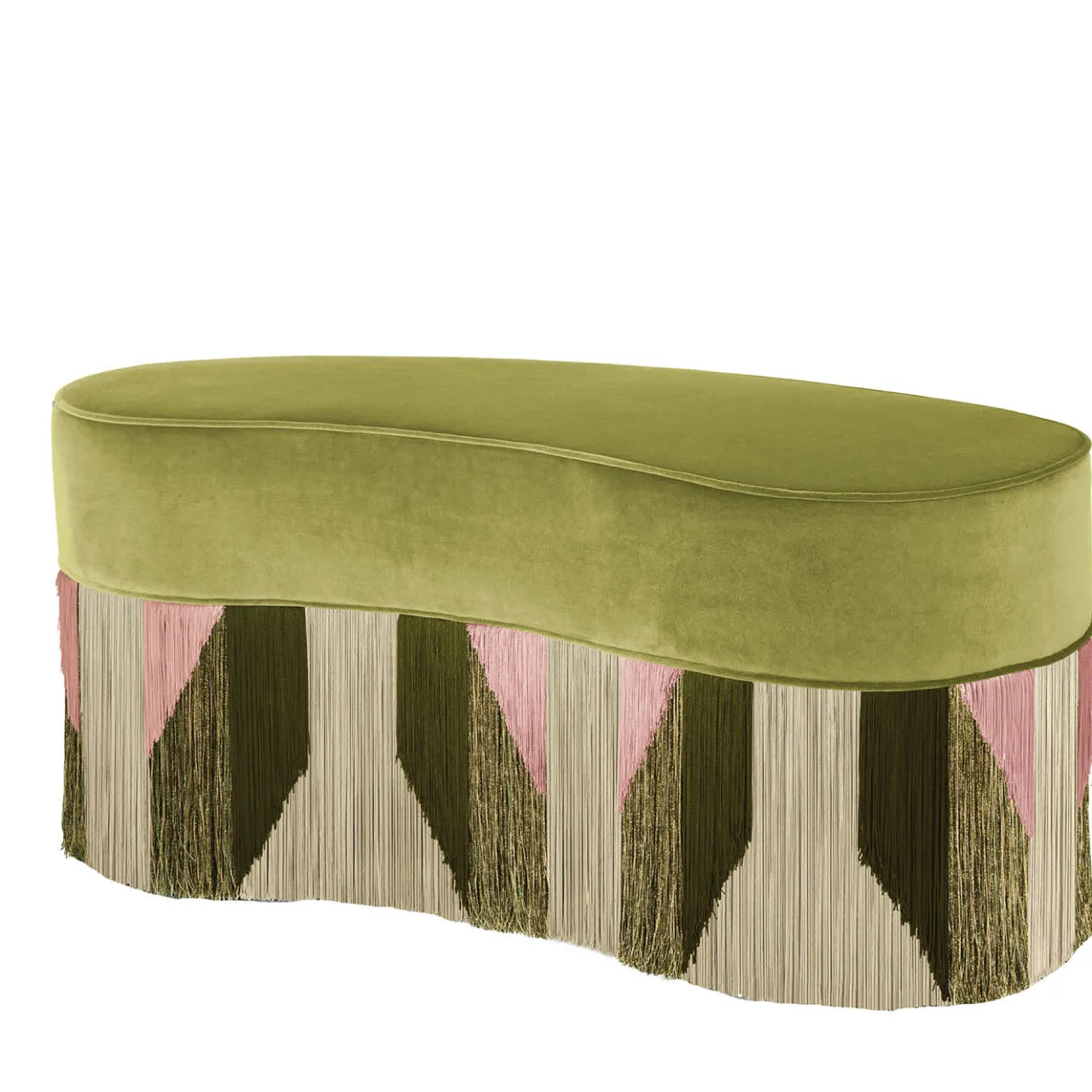 Giocosa nel suo design a fagiolo quanto suggestiva nel suo look di ispirazione esotica, questa panca brilla di eleganza sartoriale. Il pregiato velluto verde con profili coordinati riveste la seduta, completata da una cascata di frange in viscosa e lurex che delineano un motivo tribale in cui gli accenti rosa spiccano da una tavolozza di tonalità pastello, oliva e verde brillante. Si prega di contattare il Concierge per le varianti di colore.