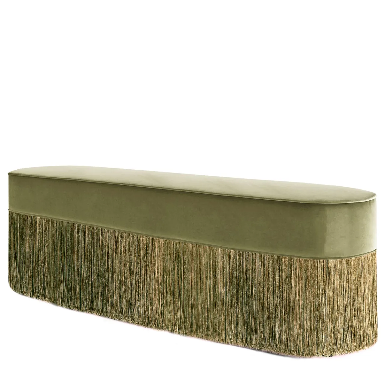 Affiancare all’estremità di un letto matrimoniale un pezzo che offra ulteriore spazio di seduta e che colpisca per il suo look elegante è l’effetto che garantisce questa superba panca. Pezzo di straordinaria qualità sartoriale, presenta un’ampia seduta curvilinea il cui rivestimento in velluto verde vibrante si abbina al trionfo di frange di viscosa scintillante che avvolgono completamente la struttura in faggio. Per le personalizzazioni, contattare il Concierge. Ogni pezzo su misura è impresso sul fondo della fodera del pouf e firmato, numerato e datato personalmente dal designer.