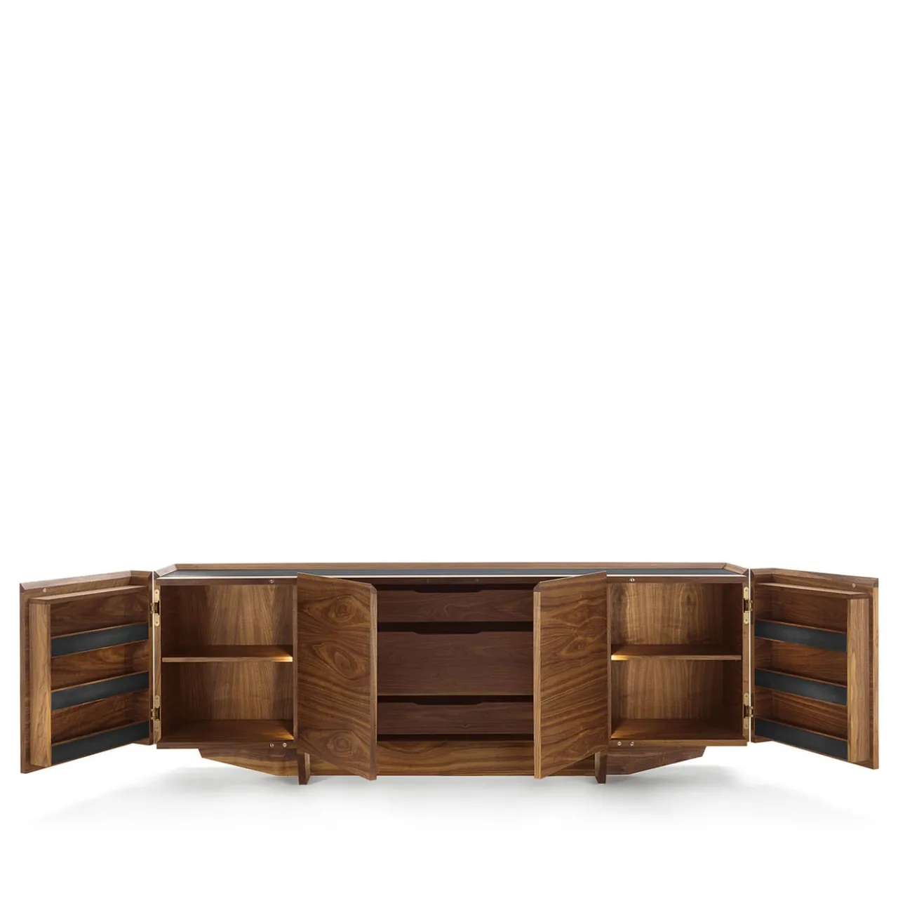 Soluzione di contenimento caratterizzata da un’ipnotizzante cornice in noce annodato, questa credenza è un’ottima soluzione per completare raffinati arredi moderni. Il suo aspetto singolare, con le sue sfumature imprevedibili e i suoi tracciati naturali, viene esaltato dall’olio, una finitura che si estende al piano in noce incassato. Il taglio geometrico della base ravviva il design.