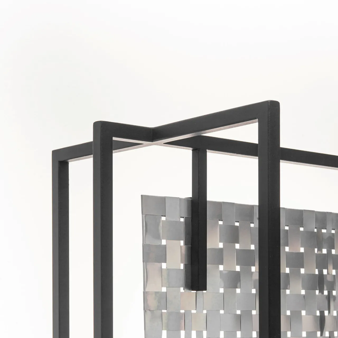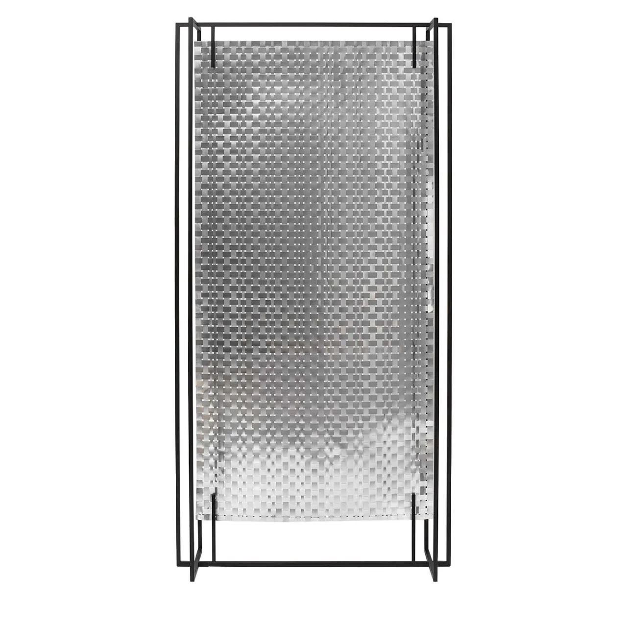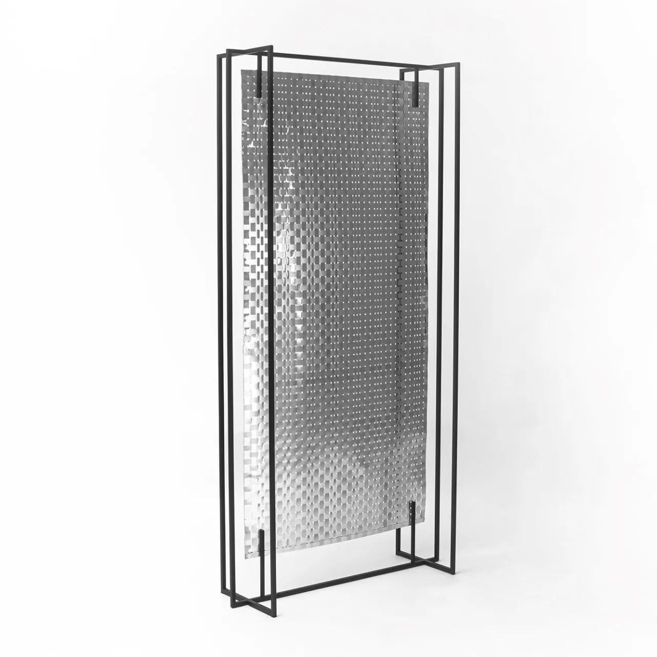 Questo pannello da pavimento a doppia funzione può essere utilizzato come divisorio o come sfondo decorativo. La tela in alluminio intrecciata a mano presenta un lato opaco e l’altro con una superficie leggermente riflettente in oro champagne. La sua struttura sottile e geometrica è dipinta di nero, che incornicia il pezzo con un tocco esclusivo. Realizzato con alluminio riciclato proveniente da rifiuti industriali.