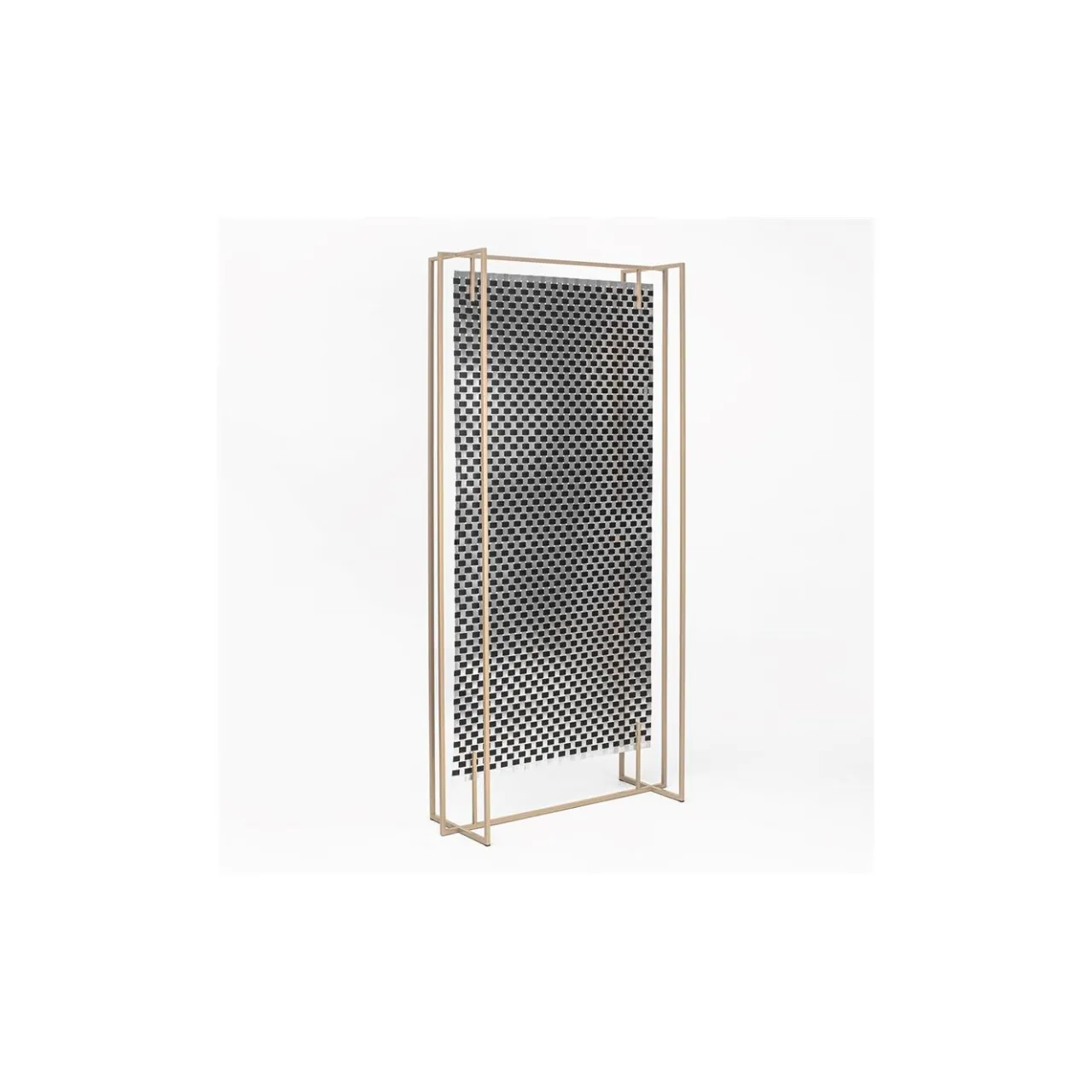 Questo sofisticato pannello da pavimento è caratterizzato da un’elegante e sottile cornice color oro e da un’elegante tela Op-Art degli anni ’60. Altamente versatile, questo stile a doppio uso può essere utilizzato come divisorio per ambienti o come sfondo decorativo se posizionato contro una parete. Il suo corpo intrecciato comprende fogli di alluminio nero e naturale recuperati durante la produzione di rifiuti industriali.