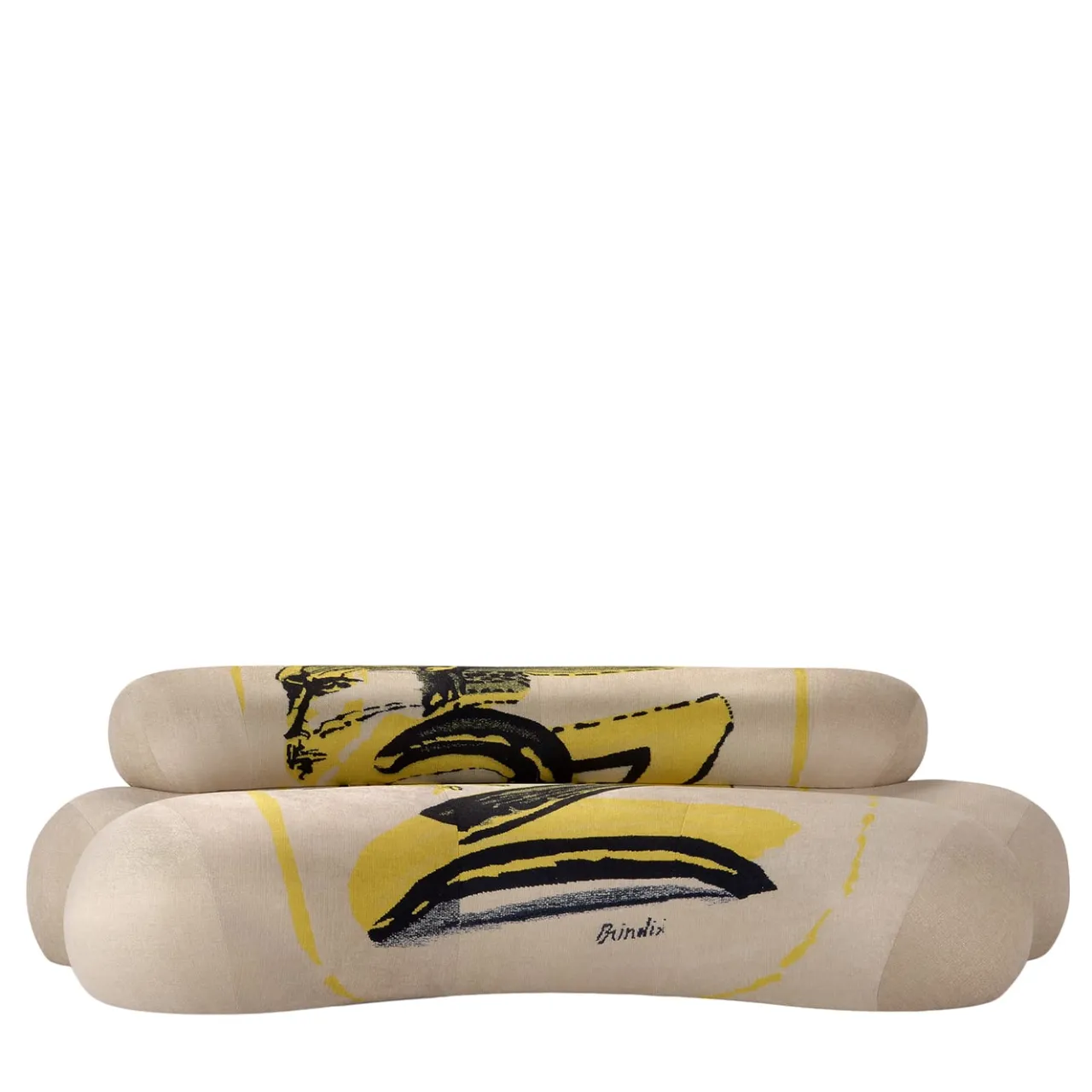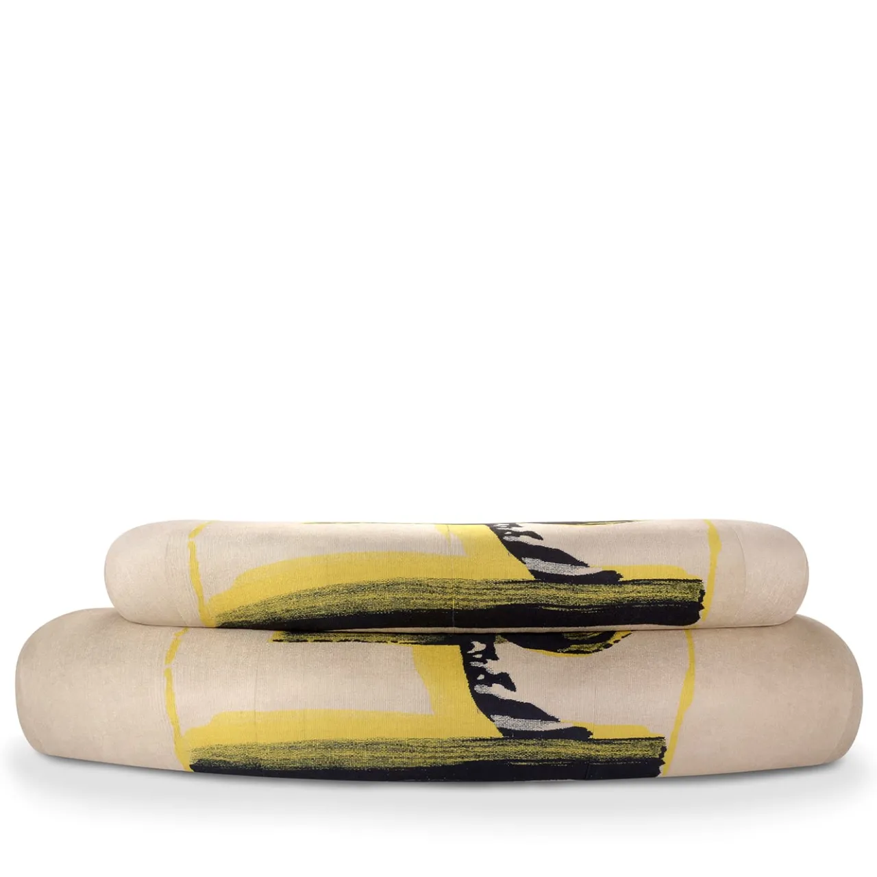 Questo pezzo unico, creato in esclusiva per Edit Napoli 2024, è rivestito con i segni e i colori caratteristici di un arazzo unico del maestro Remo Brindisi. È caratterizzato da una schiuma poliuretanica deformabile a densità variabile e da uno strato di fibra Dacron® da 100 g che ricopre una struttura in legno multistrato con cinghie elastiche. Il design del divano è completato da piedini metallici nascosti, che gli conferiscono un aspetto elegante e moderno.