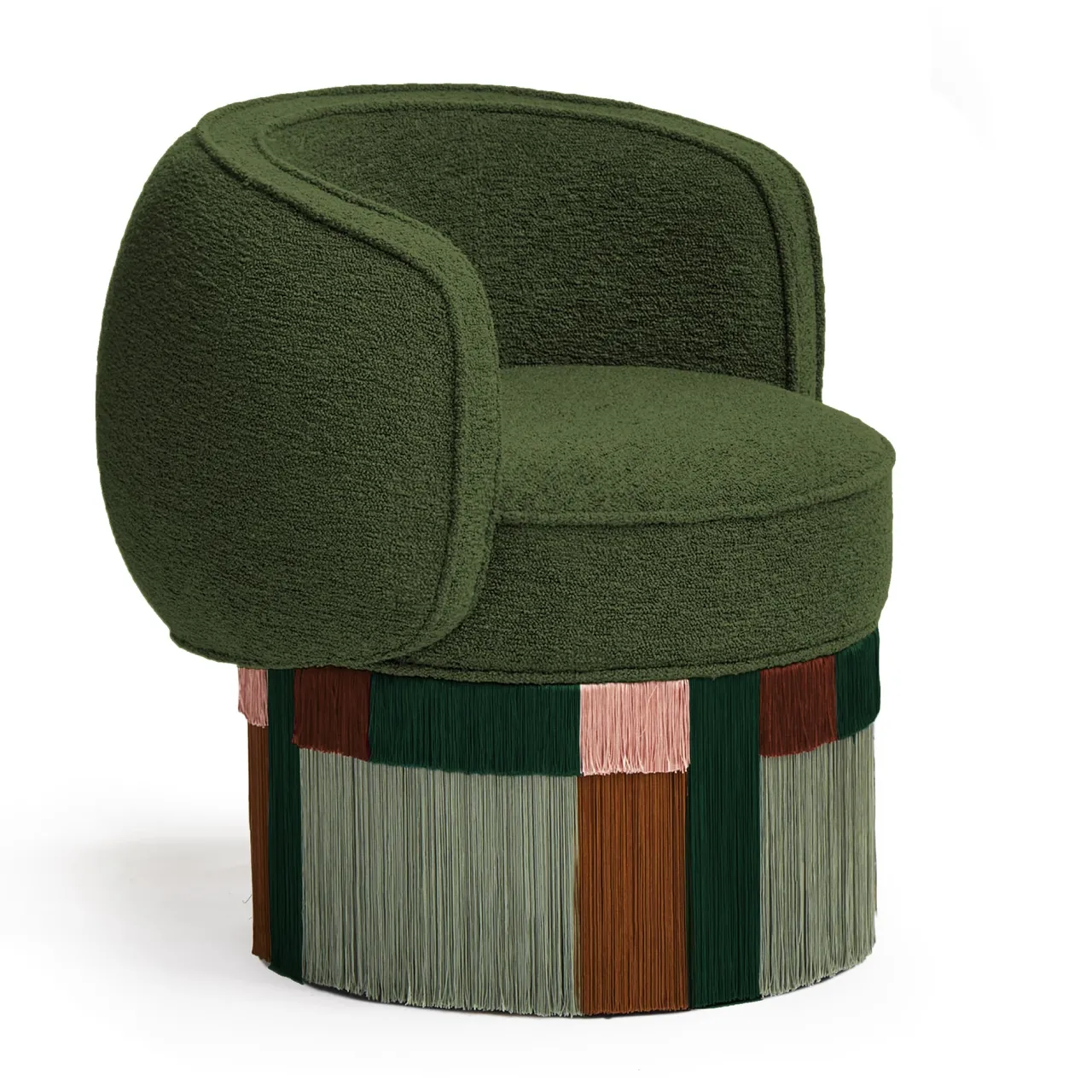 Una rivisitazione unica di una sedia classica, Pirouette Clu di Lorenza Bozzoli è completamente realizzata a mano e presenta una raffinata sedia a vasca imbottita verde oliva impreziosita da un sorprendente disegno geometrico e da una gonna a frange in viscosa lunga fino al pavimento in splendide tonalità di verde, ruggine e rosa. Da abbinare ad altri pezzi della stessa collezione. Le personalizzazioni dei colori sono disponibili su richiesta al Concierge.