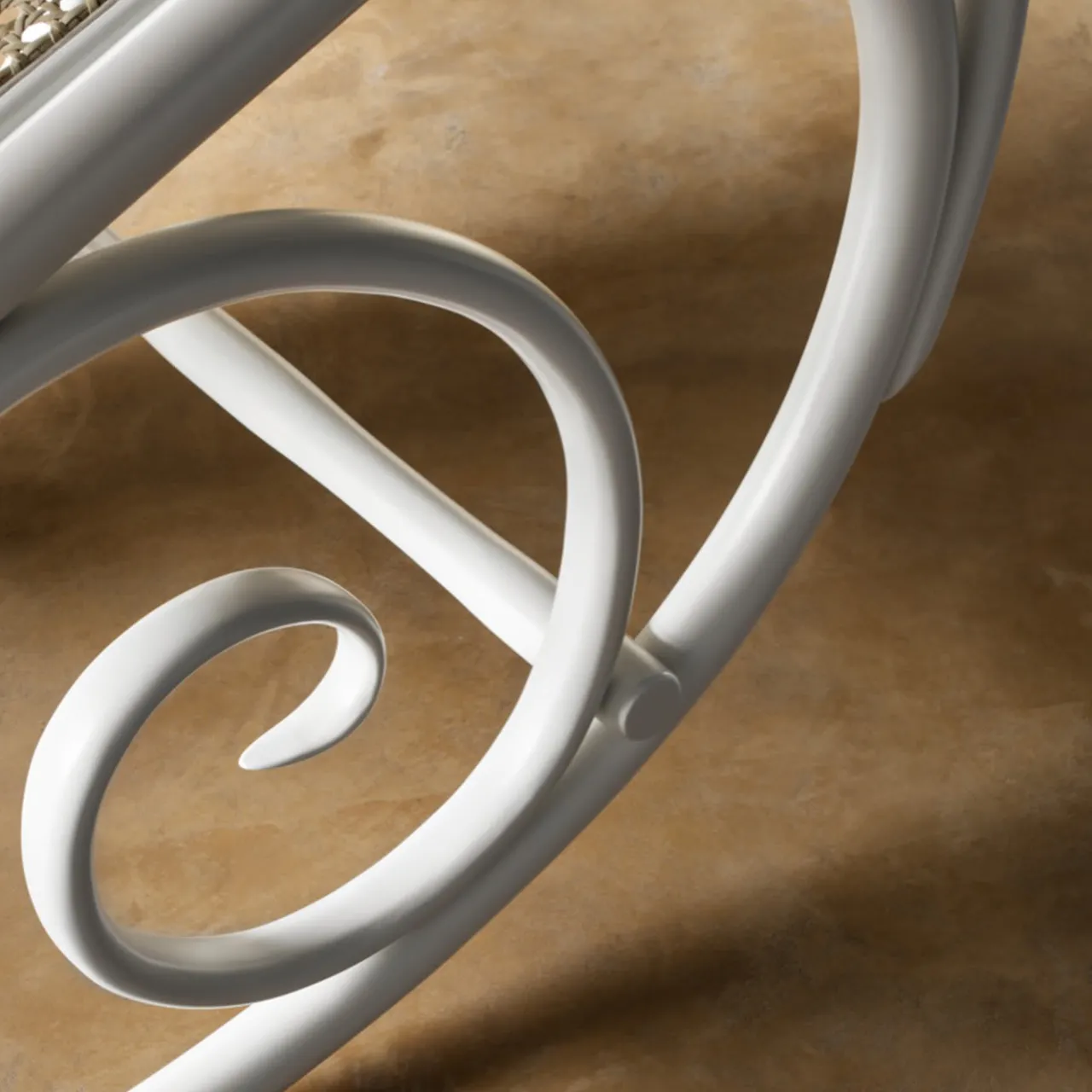 Questa splendida sedia a dondolo fa parte di una collezione disegnata da Gebruder Thonet nel 1885. Vanta due caratteristiche iconiche dell’estetica di questo marchio: la paglia viennese che riveste lo schienale e la seduta e la struttura in faggio curvato a vapore, con le sue curve elaborate che animano l’area tra la base curva e il piano. La laccatura bianca della finitura aggiunge fascino e un tocco romantico al pezzo.