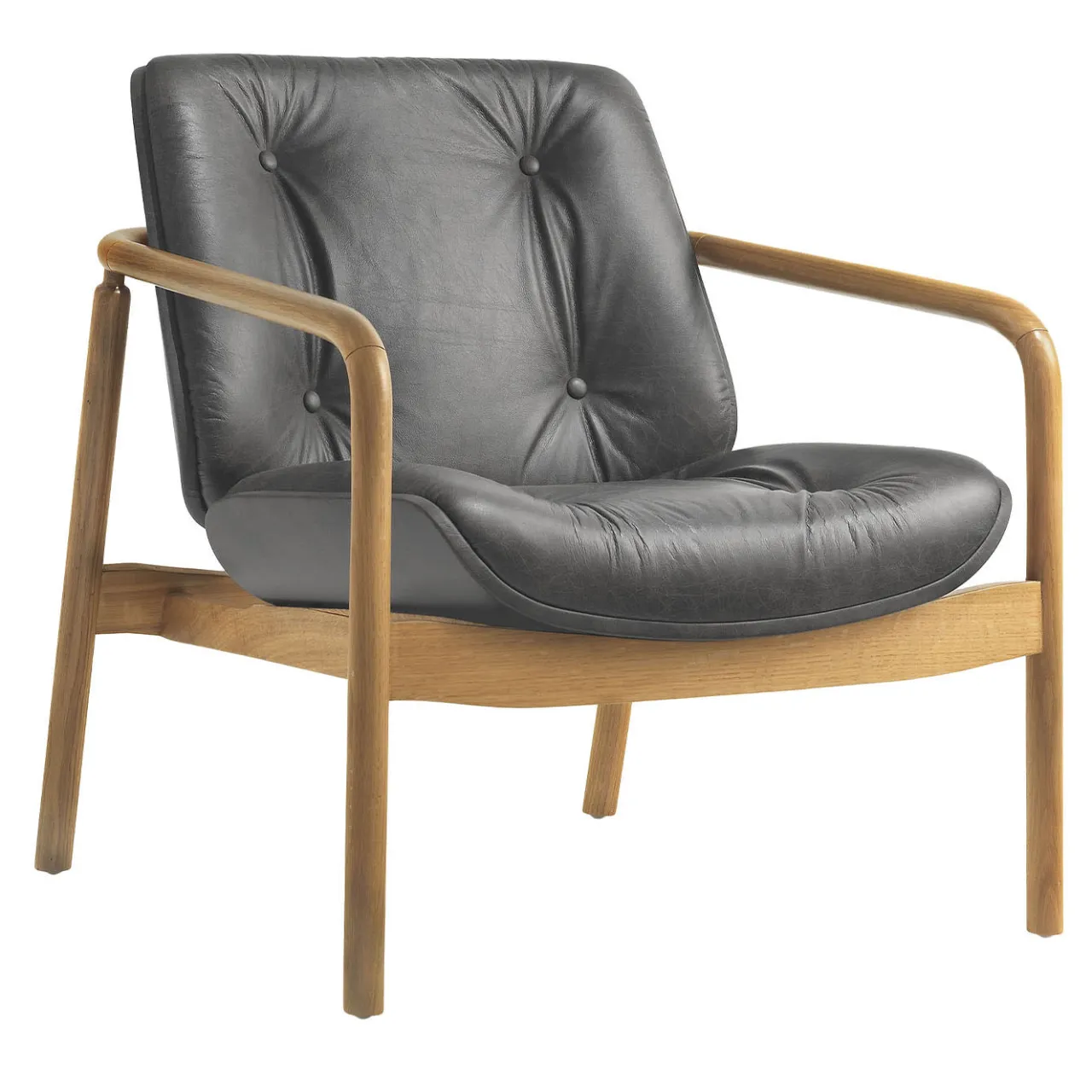 La pregiata pelle nera Siviglia, delicatamente ravvivata da una lineare bottoniera, avvolge gli ampi cuscini della seduta e dello schienale, rendendo questa poltrona capace di offrire un comfort duraturo. Ideale per ambienti professionali o residenziali, dichiara in modo inequivocabile il suo carattere contemporaneo attraverso il design tubolare della sua struttura lucidata in noce scuro, che comprende anche i braccioli inclinati.