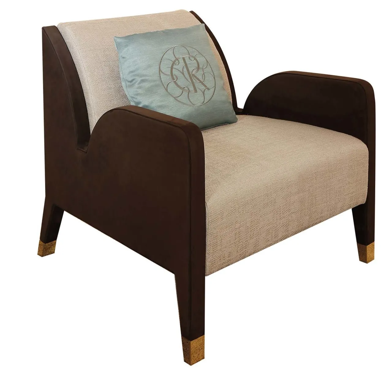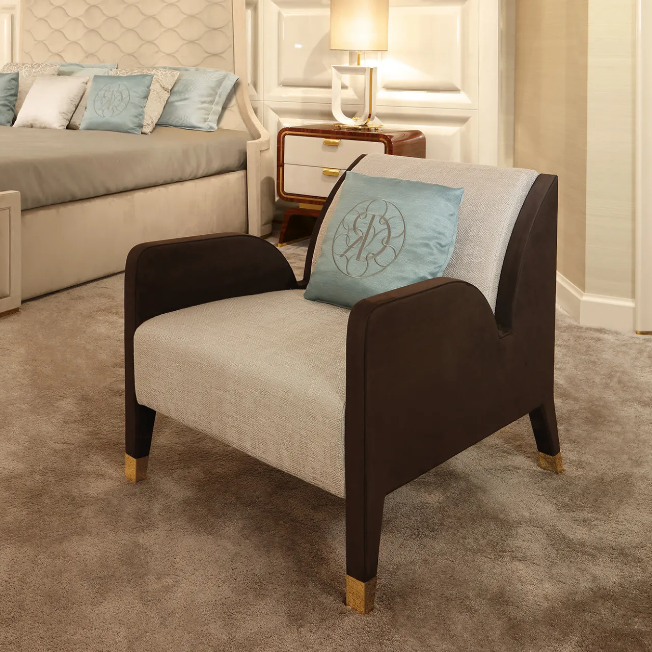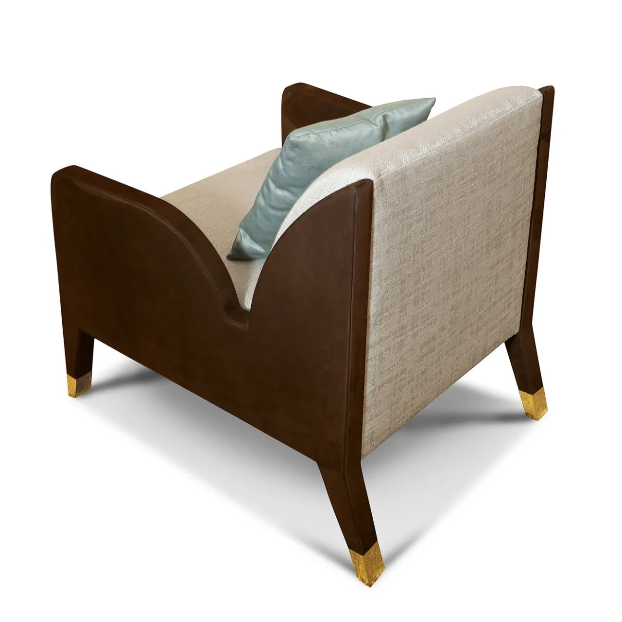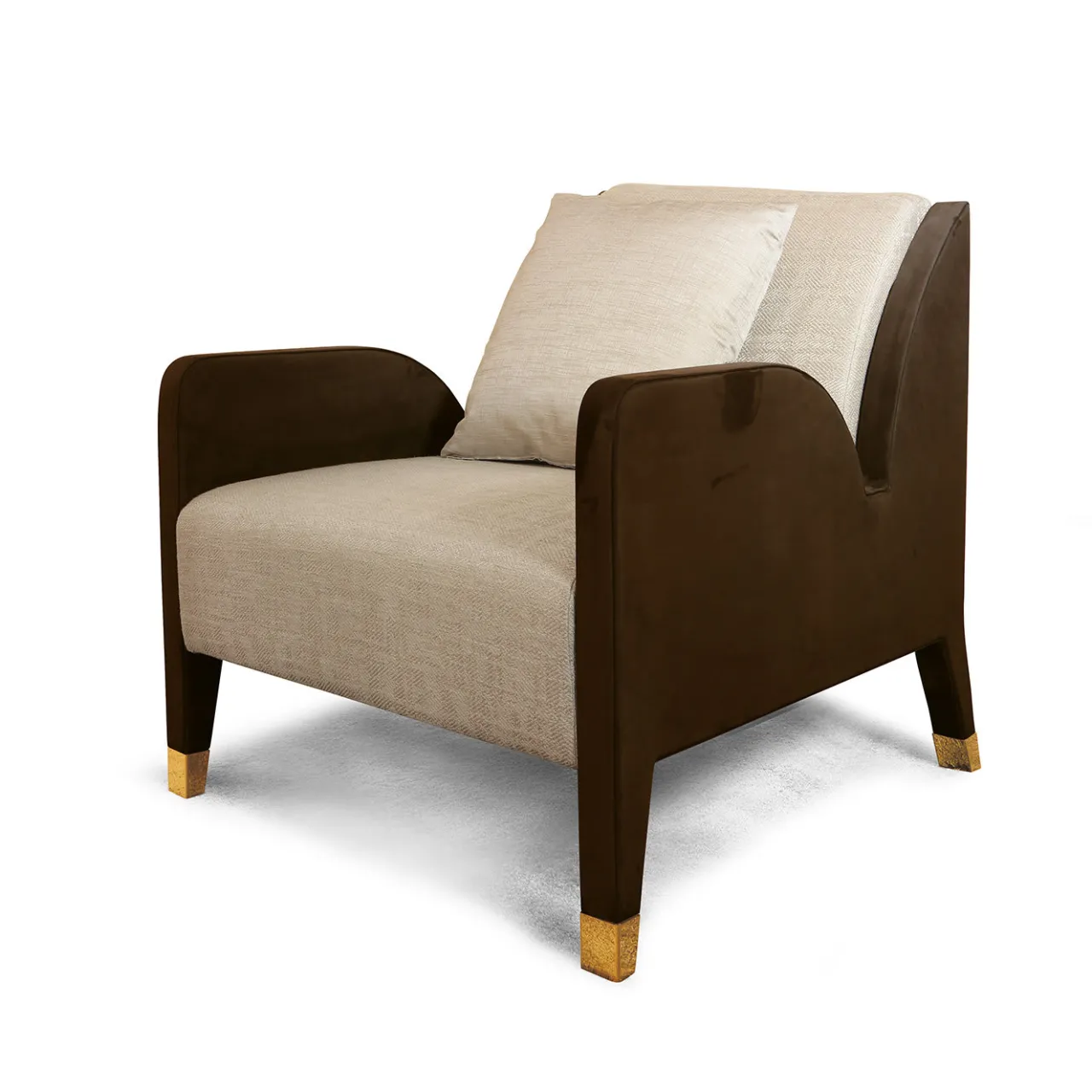La poltrona angolare Unique è realizzata in legno massiccio. Caratterizzata da una struttura elegante con linee pure e forme geometriche, questa poltrona combina fianchi in nubuck con un rivestimento in tessuto beige sulla seduta e sullo schienale. Impreziosita da dettagli in metallo dorato, questa elegante poltrona aggiunge un tocco sofisticato agli interni moderni e di transizione.