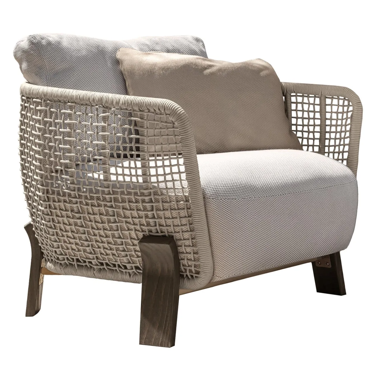Questa poltrona luminosa ed elegante può essere abbinata a una gemella su un patio per creare un angolo accogliente per le pause tè o le conversazioni notturne. La seduta, che poggia su piedi in teak leggermente ricurvi, è caratterizzata da cuscini in tessuto beige avvolti da una scocca a forma di U ornata da un fitto motivo traforato. Il cuscino decorativo beige non è incluso. Per ulteriori opzioni di colore, consultare il catalogo Artemest.