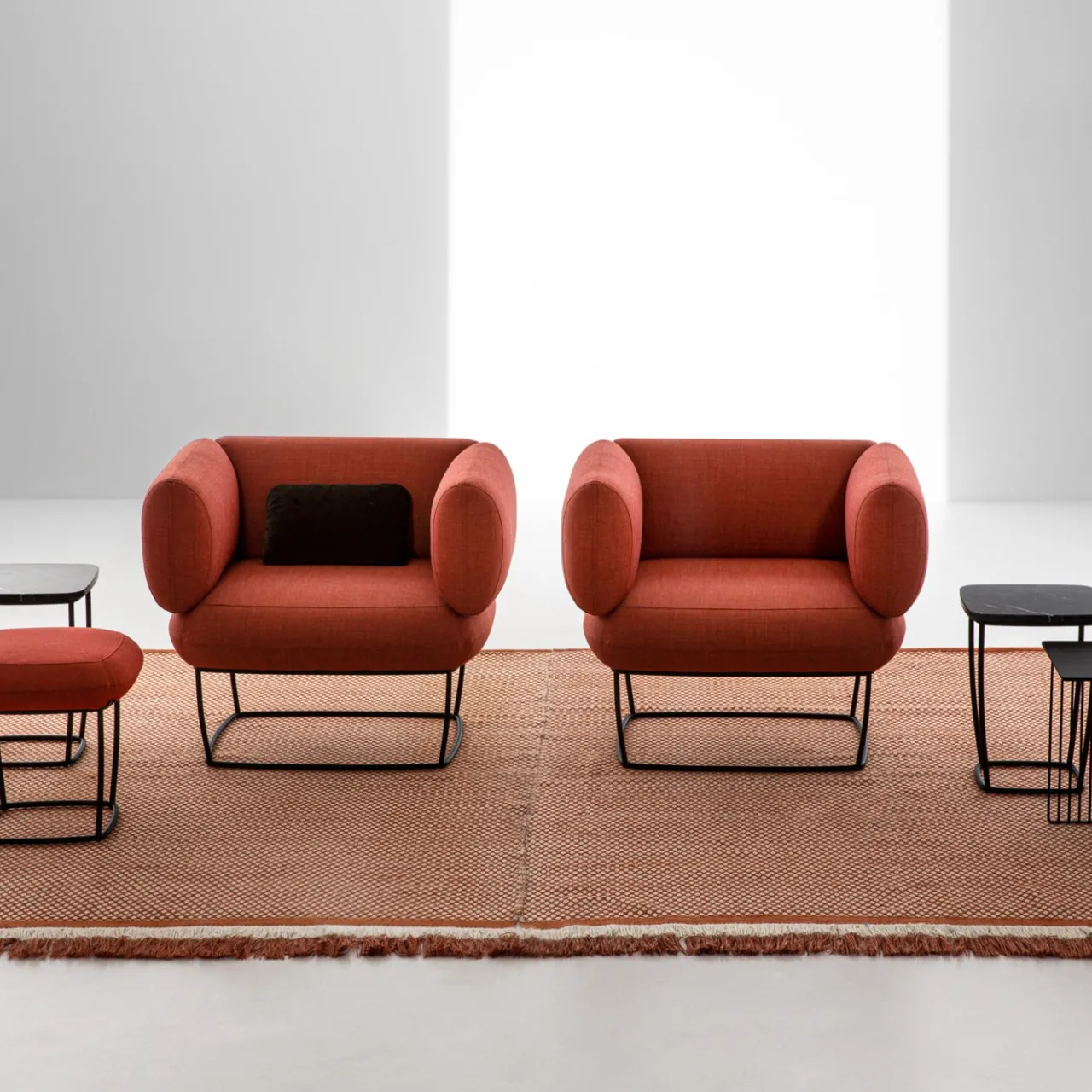 Bernard è una collezione completa e versatile, adatta sia al residenziale che al contract. Il nucleo originale è rappresentato da una sofisticata poltroncina, che si distingue per il doppio senso di seduta, ottenuto grazie al disegno di moduli identici per schienale e bracciolo, che possono variare liberamente la loro funzione. Il rivestimento in lana vergine arancione completa la base in metallo nero pece. Sono disponibili altre finiture, per informazioni rivolgersi al Concierge.