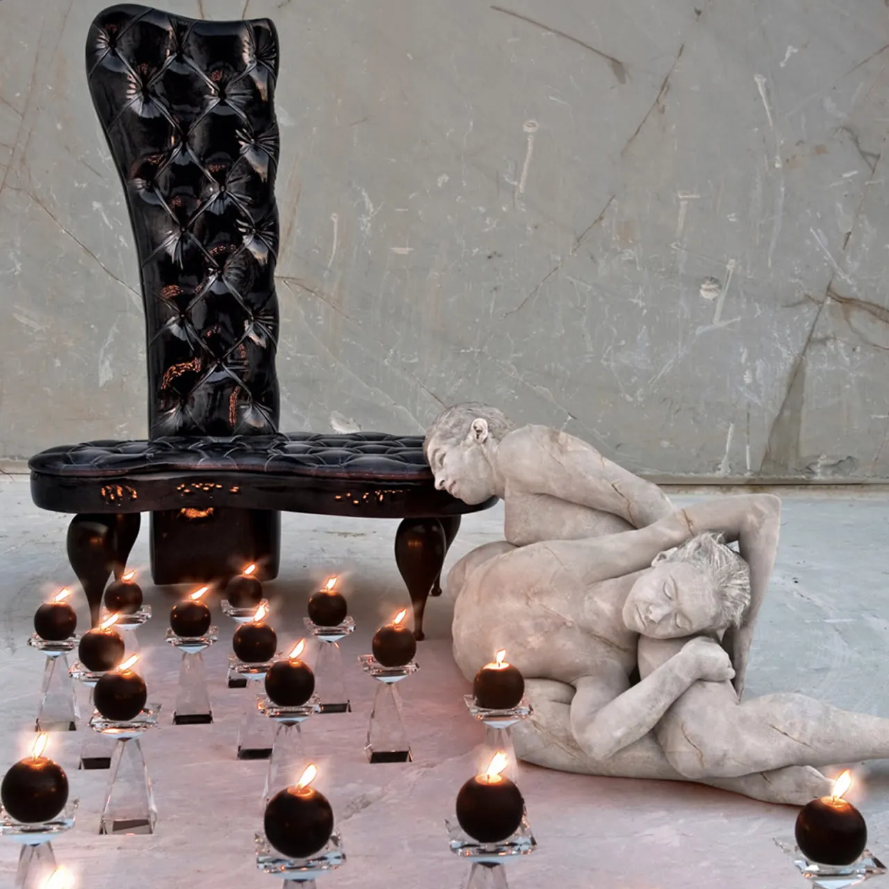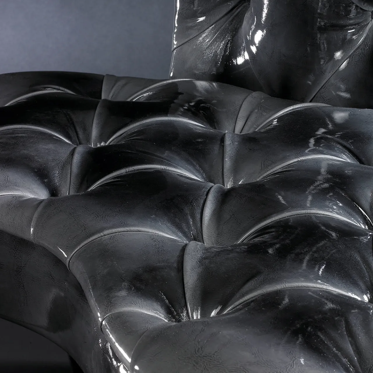 La silhouette sinuosa di questo pezzo unico è esaltata dal sensuale rivestimento in ecopelle nera lucida, che crea un effetto visivo straordinario. Interamente realizzati a mano in compensato, sia la seduta che lo schienale sono dotati di cuscini in poliuretano espanso in stile capitonne che aggiungono un tocco vintage al pezzo. I piedi a cono arrotondati e sovradimensionati, in vernice nera lucida, contribuiscono all’aspetto audace di questo pezzo straordinario.