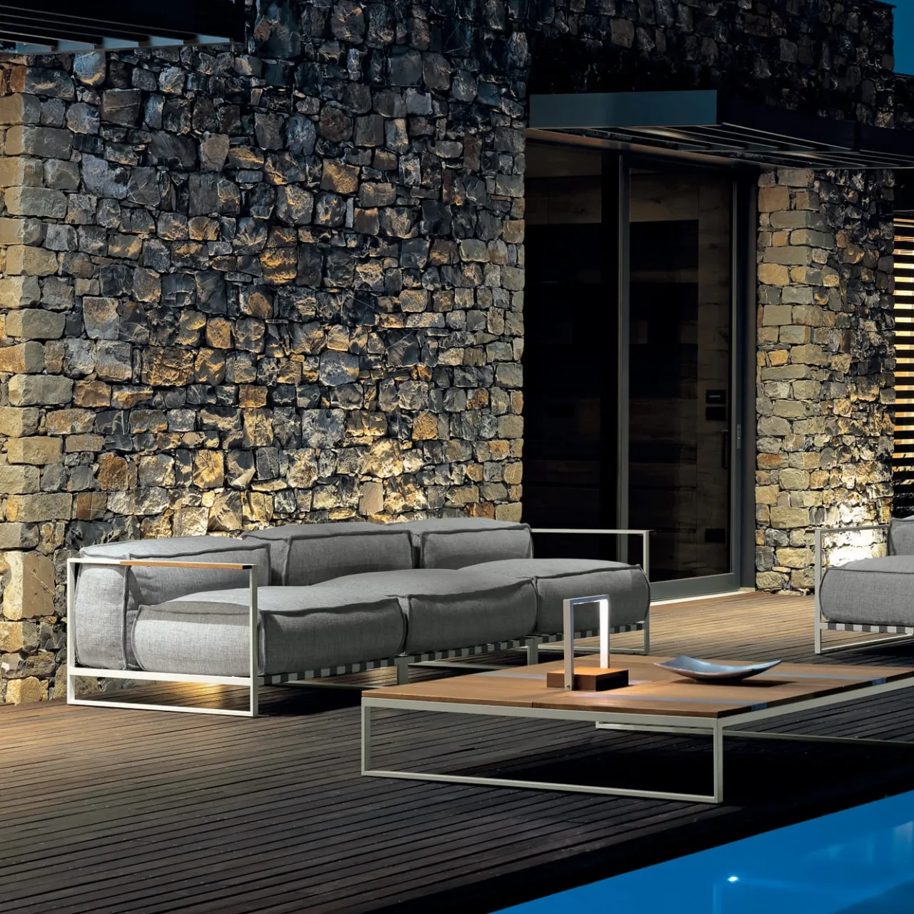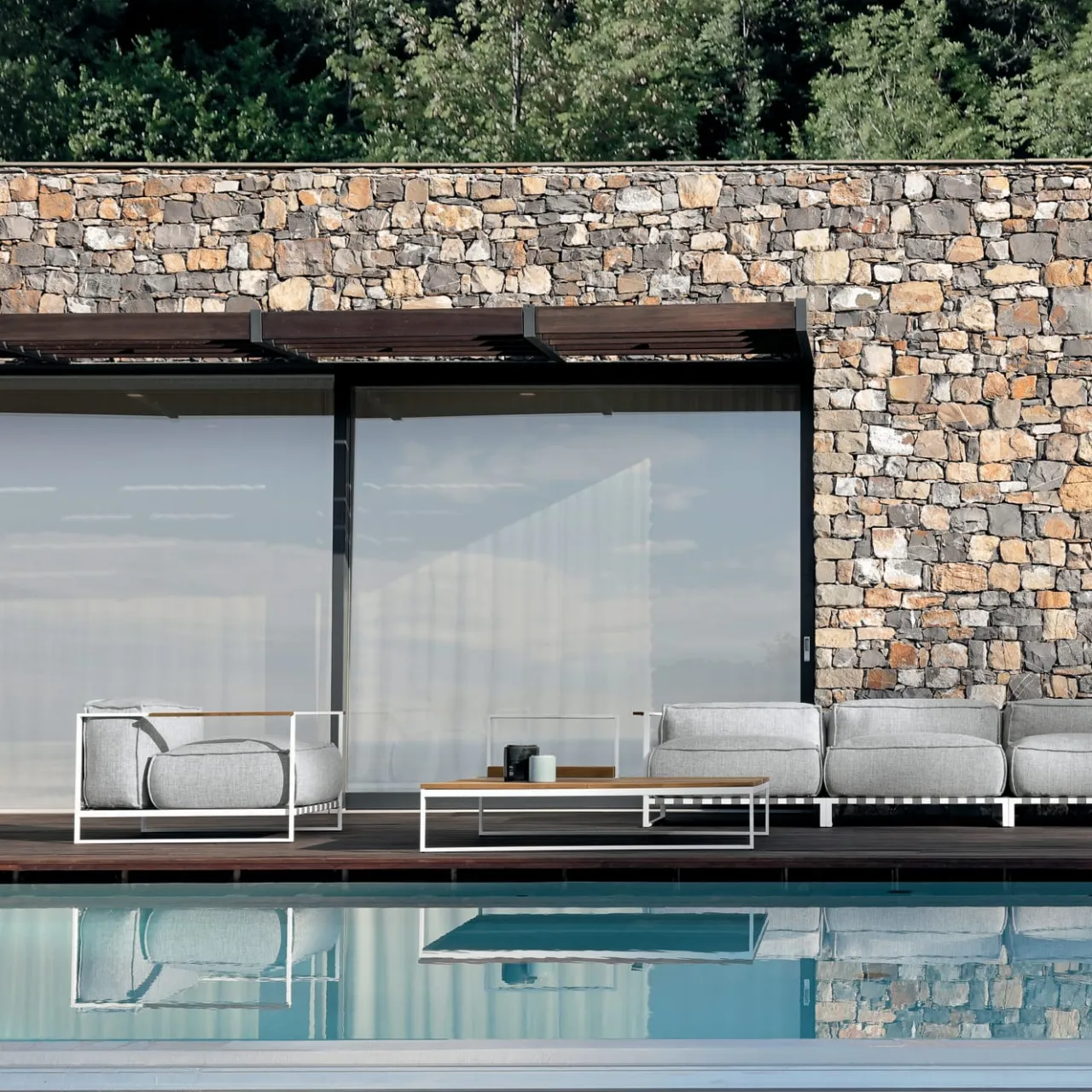 Fondendo elementi industriali e stile minimalista, questa splendida poltrona trasmette una forte personalità che infonderà un carattere distintivo a qualsiasi interno. Incorniciata da una struttura aperta in acciaio inox con finitura bianca, gli ampi cuscini della seduta e dello schienale sono sostenuti da cinghie di poliestere e sono sfoderabili in un elegante tessuto grigio chiaro. I braccioli sono impreziositi da un dettaglio rettangolare in legno di iroko. Con la sua silhouette elegante, questa poltrona è un’aggiunta sofisticata a un patio, a una veranda o a una piscina, poiché tutti i materiali sono resistenti agli agenti atmosferici e progettati per l’uso esterno.