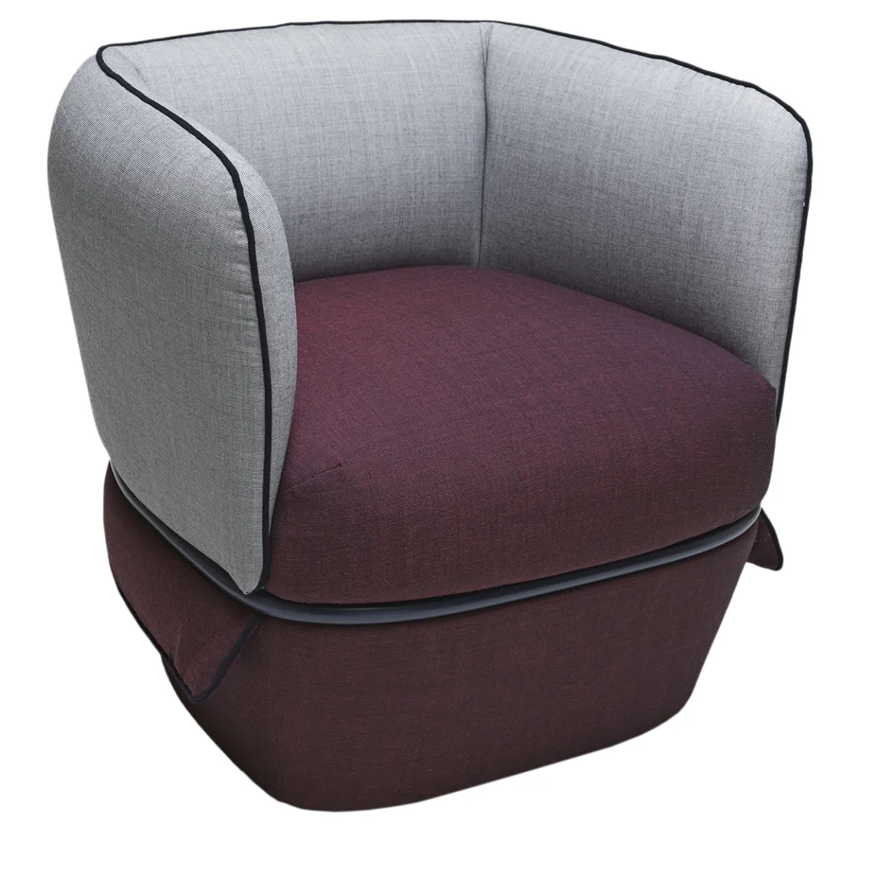 Questa poltrona signorile è un’ottima aggiunta agli arredi in stile vintage. La combinazione di rivestimenti in pelle di pesco antimacchia in grigio chiaro – per lo schienale e i braccioli incorporati (alti 72 cm) – e bordeaux crea un accattivante conflitto di tonalità che risulta esaltato dai dettagli delle bordature nere e dall’anello metallico laccato in blu cobalto che sottolinea la base della seduta. Il massimo comfort è assicurato dalla generosa imbottitura in poliuretano foderata in poliestere. Chiedere al Concierge per altri colori.