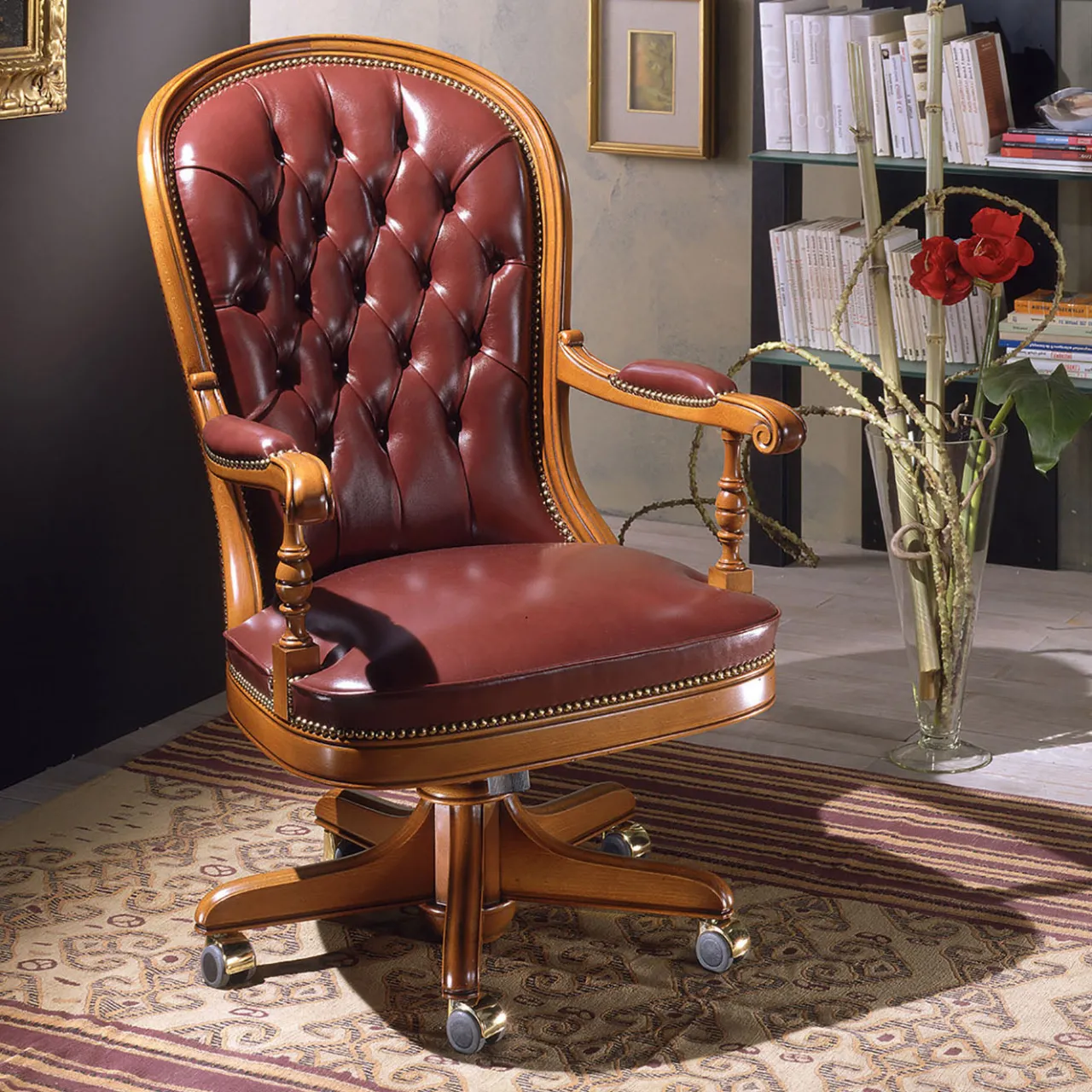 Poltrona girevole di lusso in stile classico con struttura in legno di faggio. L’altezza del sedile è regolabile e il meccanismo di oscillazione aiuta a mantenere una gamma completa di movimenti, bilanciando la postura. È imbottita con fettucce e schiuma di qualità superiore. Il rivestimento con bottoni profondi esalta particolarmente il lusso di questo modello e ne sottolinea il design avvolgente: la pelle di toro conciata riflette un’eleganza riservata. Sono disponibili altri colori di pelle, contattando il nostro Concierge.