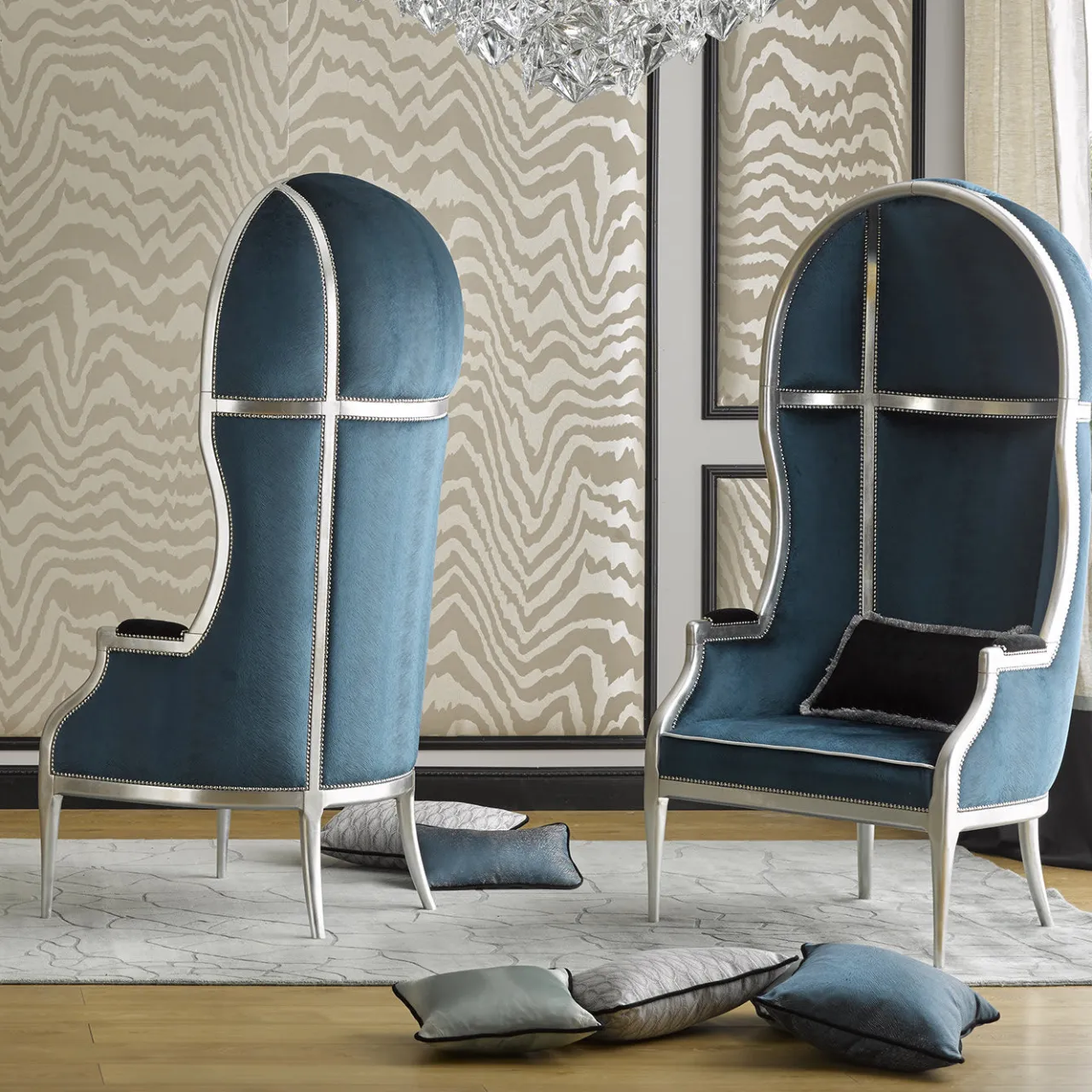 Questa elegante poltrona ha un ampio schienale a cappuccio ed è rivestita in un delizioso velluto blu scuro. La struttura della poltrona, in foglia d’argento lucida, crea una singolare forma a croce sotto il cappuccio. Questa poltrona dal design unico può essere utilizzata da sola o per aggiungere un tocco di lusso a qualsiasi ambiente.