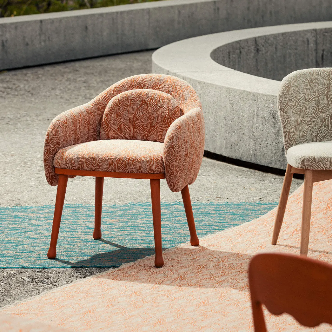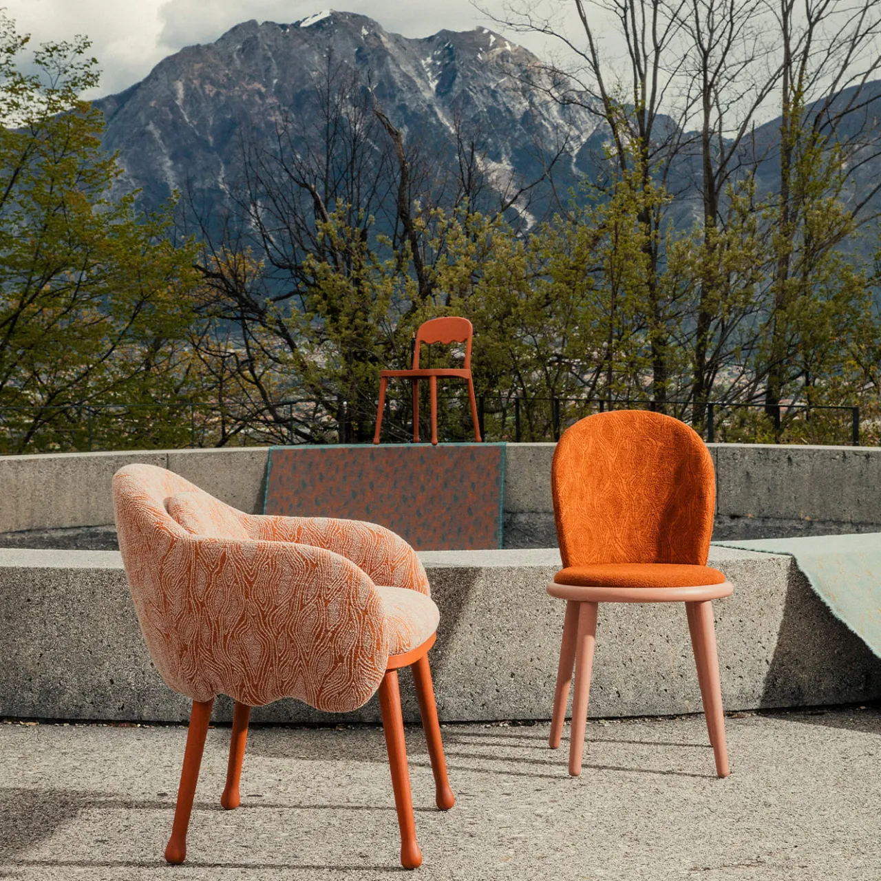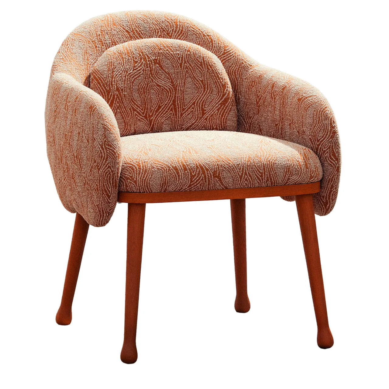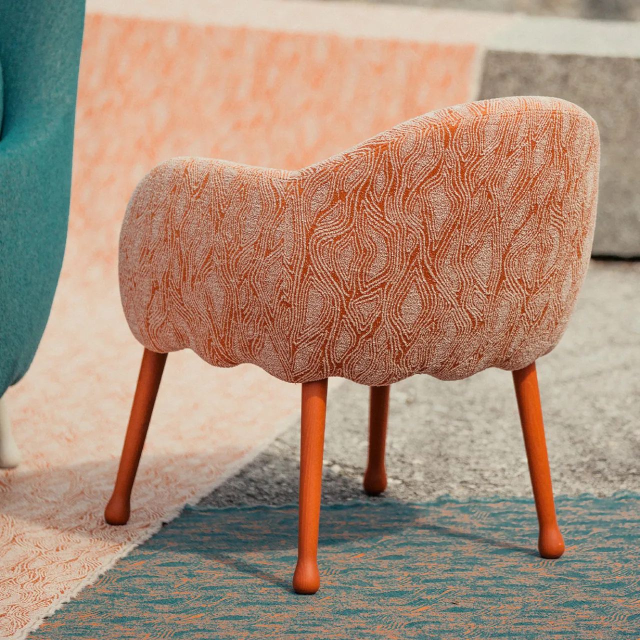 Questa poltroncina glamour conferisce agli interni moderni un fascino eclettico, enfatizzato dall’ispirazione floreale rivelata dal bordo smerlato che delinea il profilo inferiore della seduta e dalle gambe a stelo in frassino massiccio laccato arancione. Lo schienale è caratterizzato da fianchi avvolgenti che degradano dolcemente per abbracciare la seduta alta 48 cm, come una corolla di petali abbraccia un pistillo. Un intricato motivo beige emerge dal tessuto arancione che avvolge i volumi del pezzo.