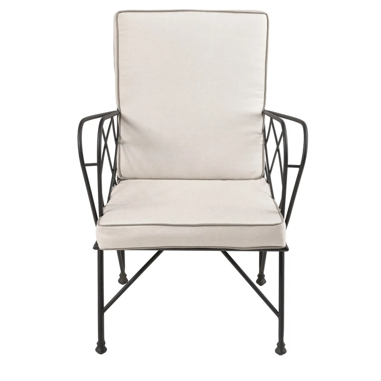 Questa poltrona da esterno combina una raffinatezza senza tempo con un tocco contemporaneo. Realizzata in ferro antracite, presenta un design classico rivisitato con linee intricate e intrecciate sotto i braccioli, che formano un sofisticato reticolo metallico. La sedia è dotata di cuscini morbidi e resistenti alle intemperie, che garantiscono comfort e durata. Perfetta per rilassarsi in giardino o per ospitare riunioni eleganti in veranda.