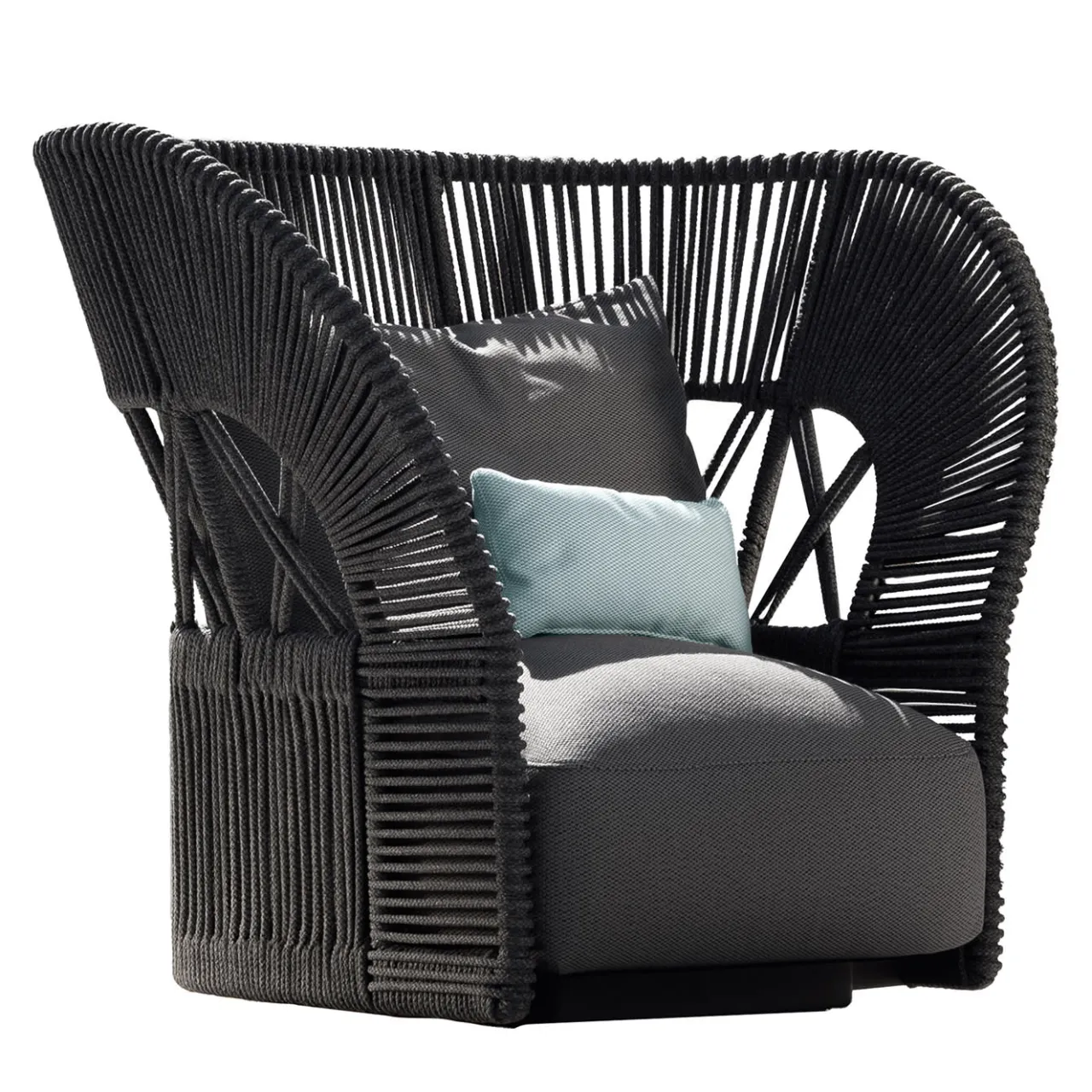 Disegnata da Ludovica e Roberto Palomba nell’ambito della linea di arredi per esterni Cliff Deco, questa straordinaria poltrona lounge è un invito al massimo relax. Presenta una caratteristica struttura in alluminio con uno schienale alto e avvolgente, arricchito da dettagli in corda nautica, intrecciati a mano intorno alla struttura. I cuscini della seduta e dello schienale sono rivestiti con un tessuto grigio coordinato. Il cuscino decorativo non è incluso.