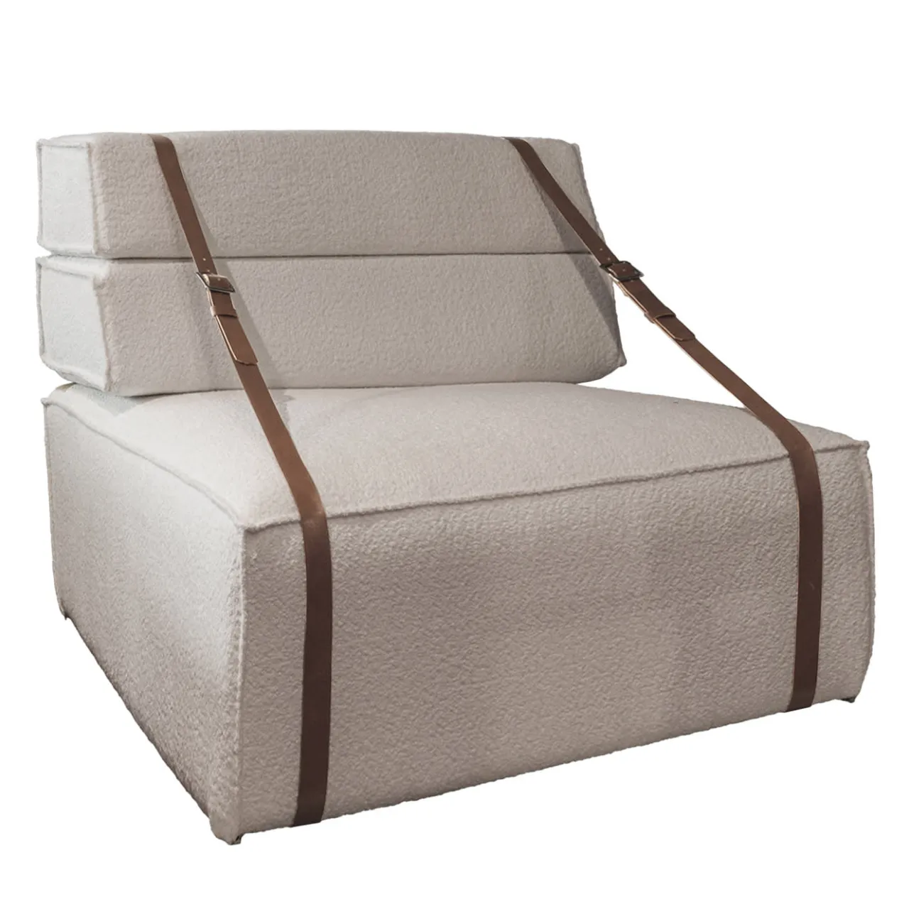 Questa poltrona, definita da cuscini morbidi e voluminosi e da una forma unica, unisce lusso e sostenibilità. Realizzata con tessuto “bio-cotone” riciclato al 100%, offre una soluzione di seduta ecologica e confortevole. Il tessuto bianco offre un fascino senza tempo, completato da una cinghia in pelle marrone che evoca lo spirito delle valigie vintage. È disponibile in due dimensioni: una poltrona maxi (100 x 100 cm) o una versione più piccola (45 x 45 cm, H. 45 cm), con possibilità di personalizzazione per finiture e tessuti.