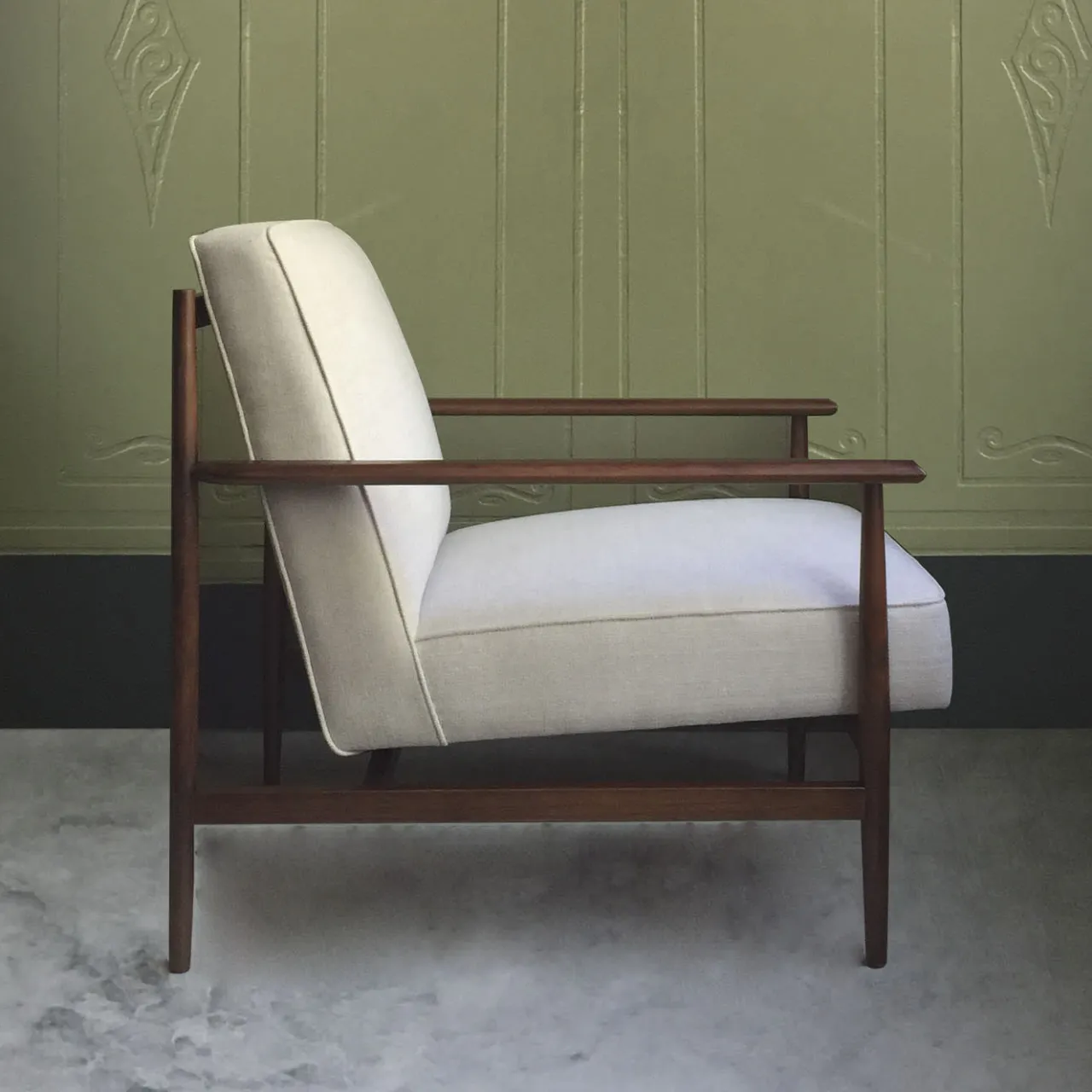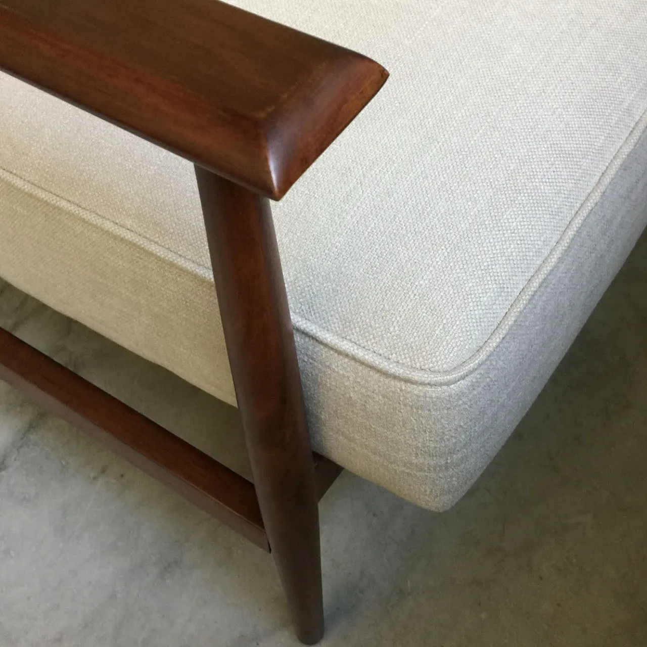 Disegnata da Monica Geronimi e ispirata al design pulito e anonimo dei mobili brasiliani degli anni ’50, Gaia è un oggetto raffinato che unisce comfort ed eleganza. La struttura di Gaia è realizzata da esperti artigiani in pregiati legni di noce e frassino. La seduta può essere rivestita in velluto, pelle Elmo o tessuto, eventualmente anche fornito dal cliente. La personalizzazione garantisce la possibilità di inserire Gaia in qualsiasi ambiente. Qui presentata in noce e tessuto “manopesca” lino-cotone panna.