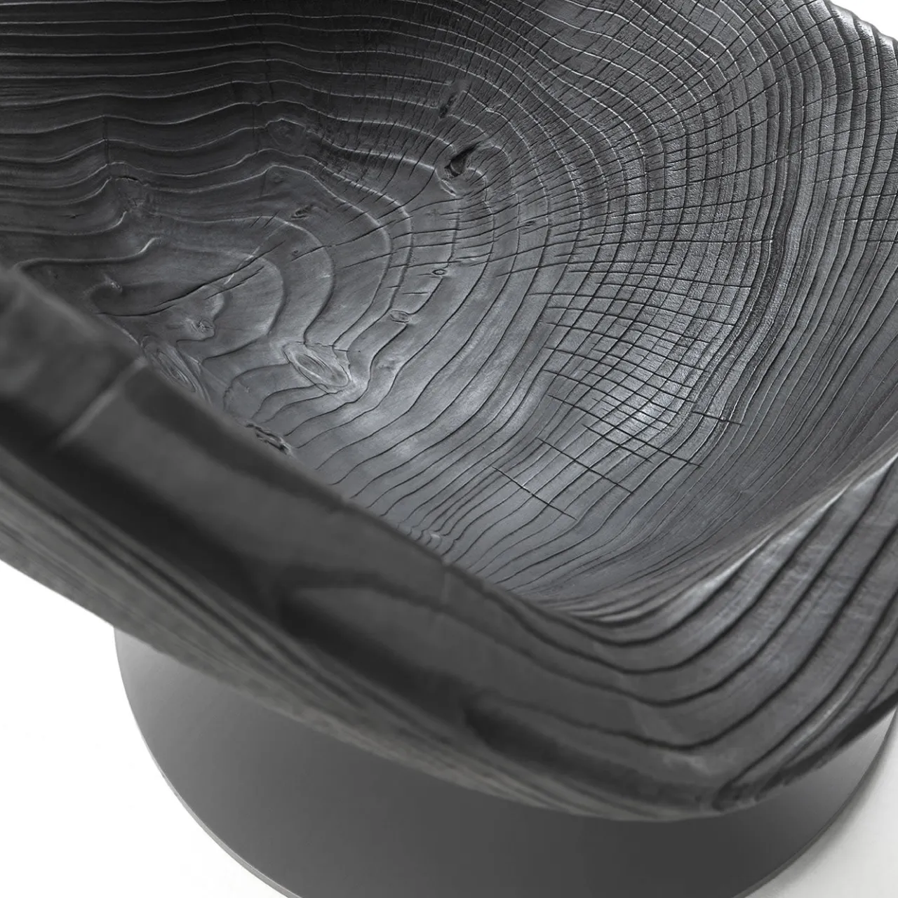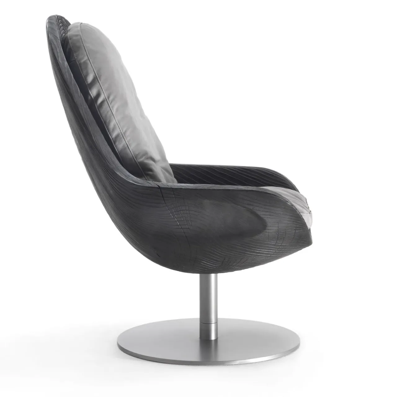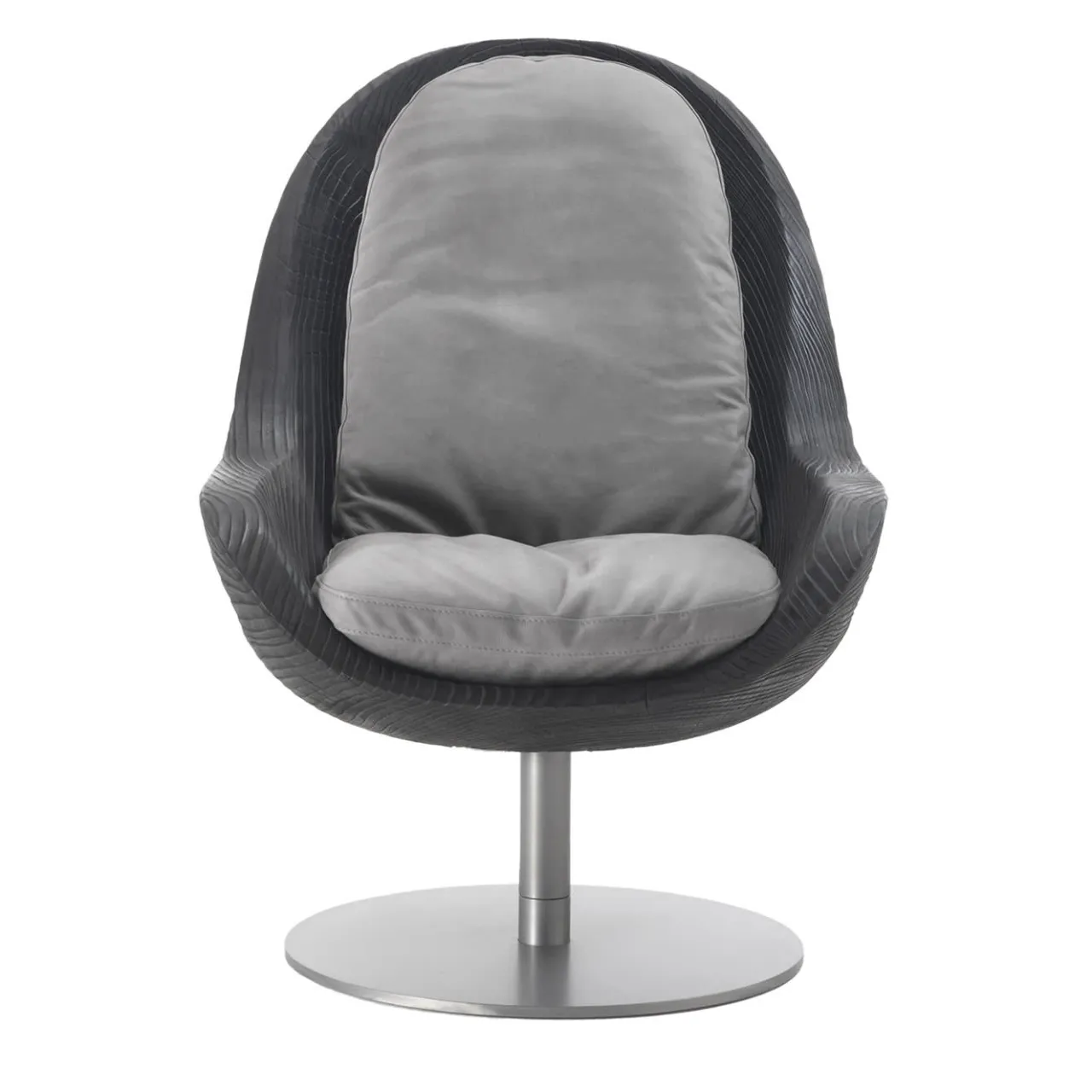Questa elegante poltrona girevole è stata progettata all’insegna della fluidità e della compattezza. Il carattere artificiale della base in ferro laccato grigio metallizzato contrasta con le superbe venature naturali della scocca in cedro nero vulcano, che integra i braccioli nei fianchi inclinati. Il generoso sistema di cuscini è rivestito in morbidissima pelle scamosciata grigia, per un maggiore piacere tattile.