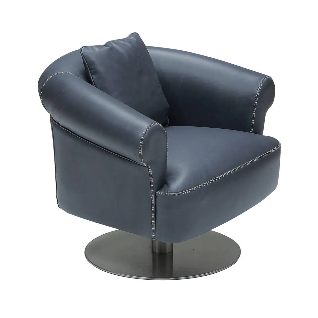 Perfetta per essere esposta in interni commerciali o residenziali sobri, questa poltrona girevole offre un comfort ineguagliabile grazie alla generosa imbottitura (85% poliuretano ad alta densità e 15% fibra di poliestere) e al pregiato rivestimento in pelle nabuk nera. La sua struttura, apparentemente semplice, poggia su un elemento tubolare in metallo (alto 23 cm) che si erge da una base rotonda in metallo (diametro 55 cm) e comprende uno schienale/braccioli avvolgenti che degradano dolcemente verso la parte anteriore. Il sistema di sostegno del telaio è costituito da cinghie elastomeriche.