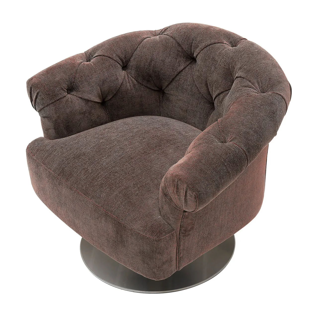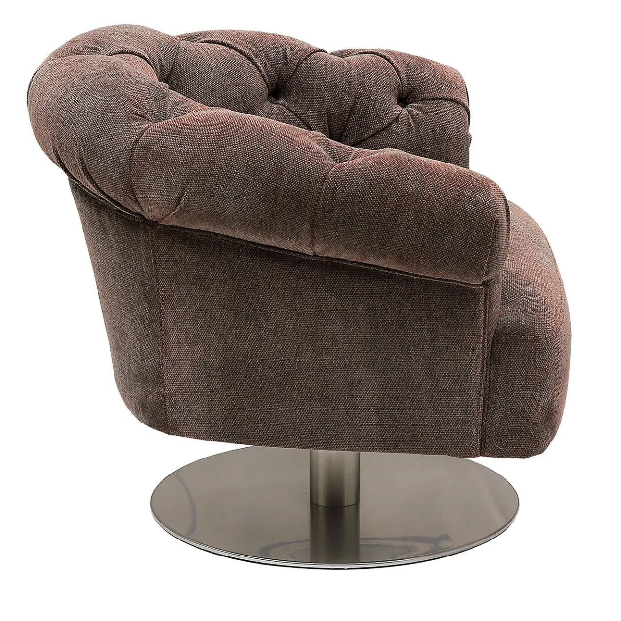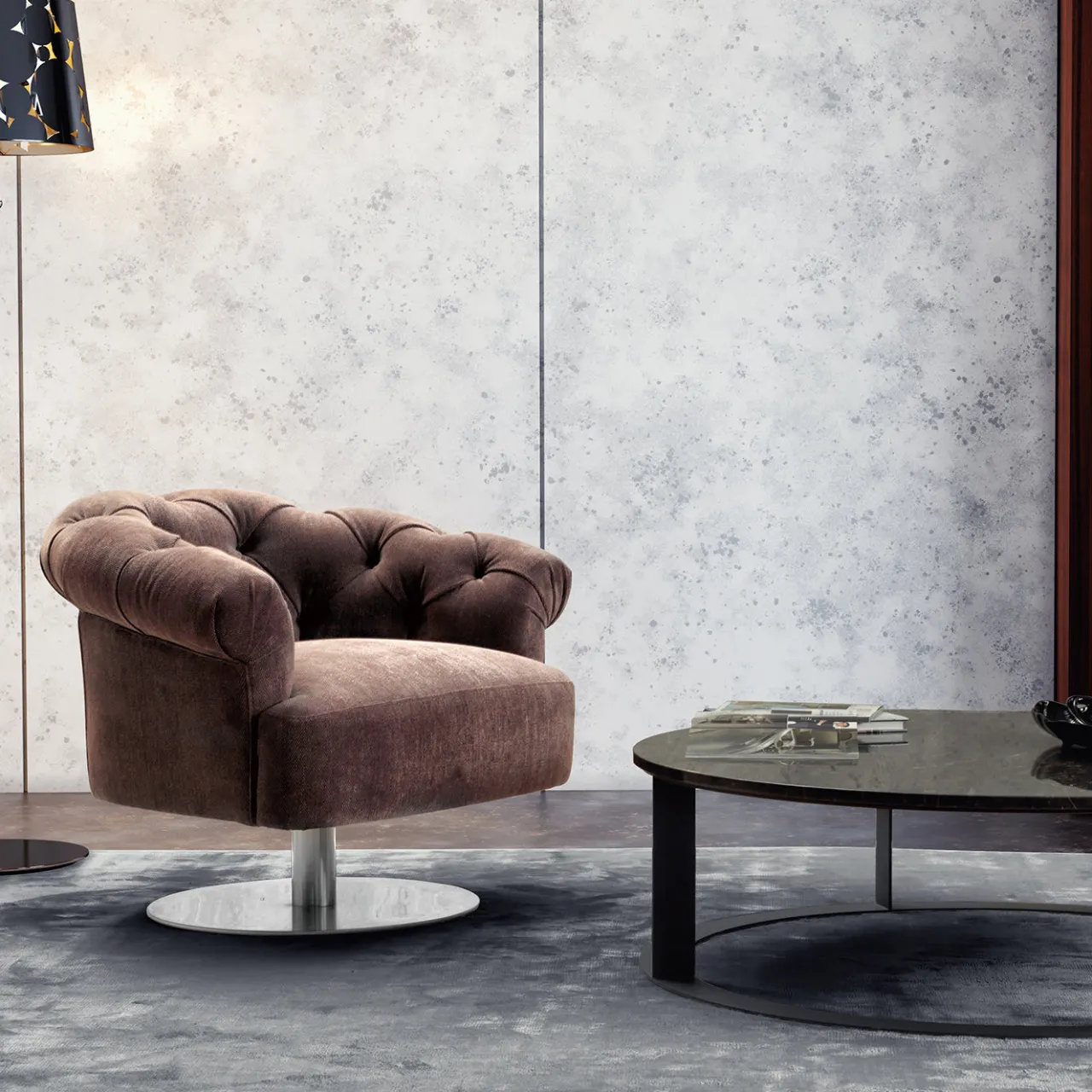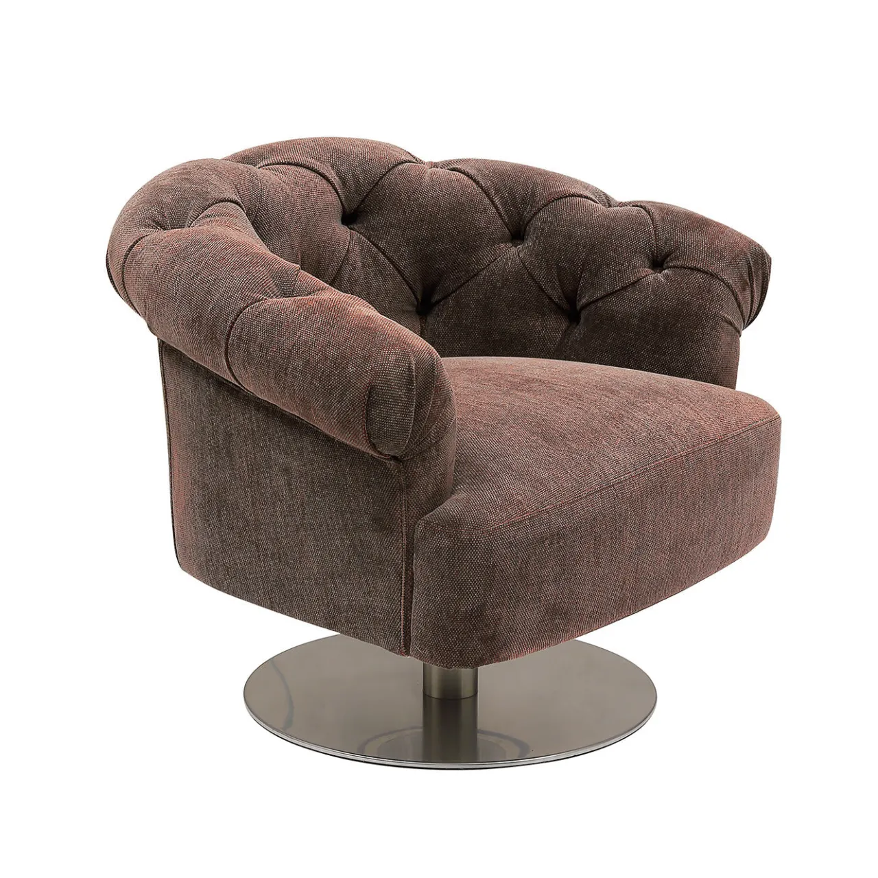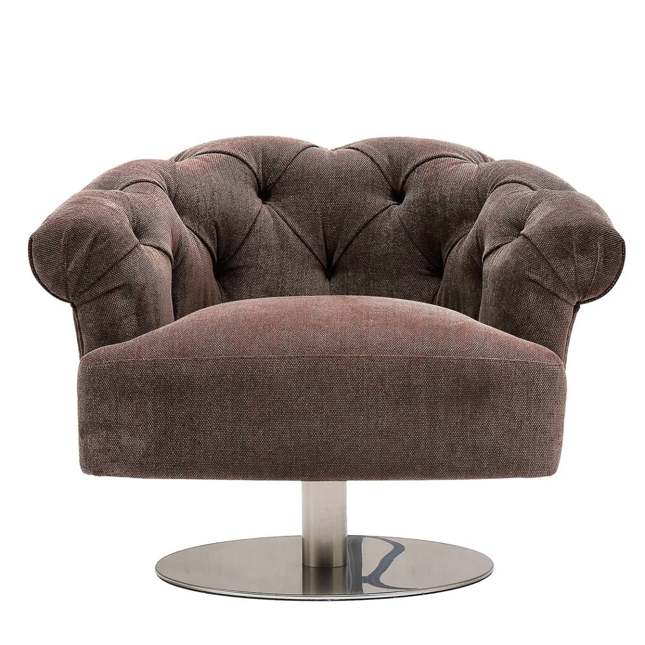 Questa poltrona girevole glamour sintetizza una silhouette invitante e sinuosa con una sobria nuance di rivestimento in tessuto marrone. Da una base circolare (55 cm di diametro), un elemento cilindrico in metallo alto 23 cm sostiene la struttura, un mix di faggio (80%) e abete (20%), dotata di cinghie elastomeriche e imbottita in poliuretano ad alta densità e fibra di poliestere. La seduta morbida è abbracciata da uno schienale arrotondato in stile capitonné che aggiunge una qualità senza tempo al pezzo.