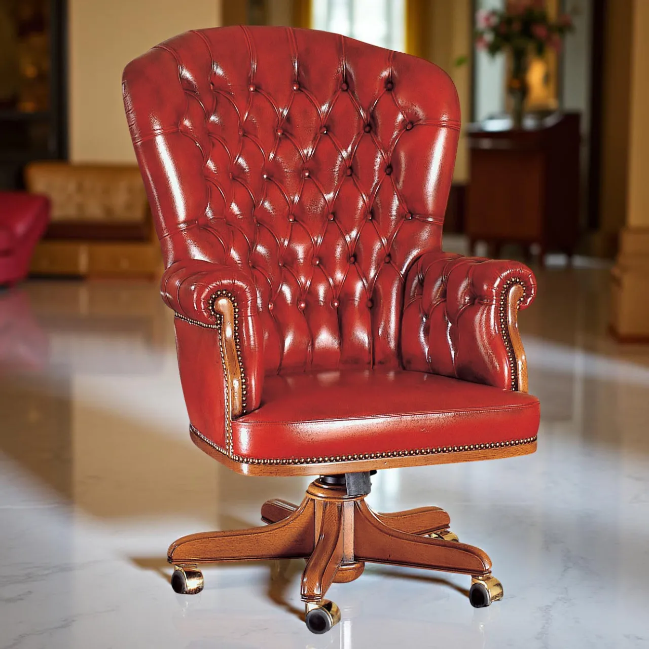 Poltrona girevole di lusso in stile classico con struttura in legno di faggio. L’altezza del sedile è regolabile e il meccanismo di oscillazione aiuta a mantenere una gamma completa di movimenti, bilanciando la postura. È imbottita con fettucce e schiuma di qualità superiore. Il rivestimento con bottoni profondi esalta particolarmente il lusso di questo modello e ne sottolinea il design avvolgente: la pelle di toro conciata riflette un’eleganza riservata. Sono disponibili altri colori di pelle, contattando il nostro Concierge.