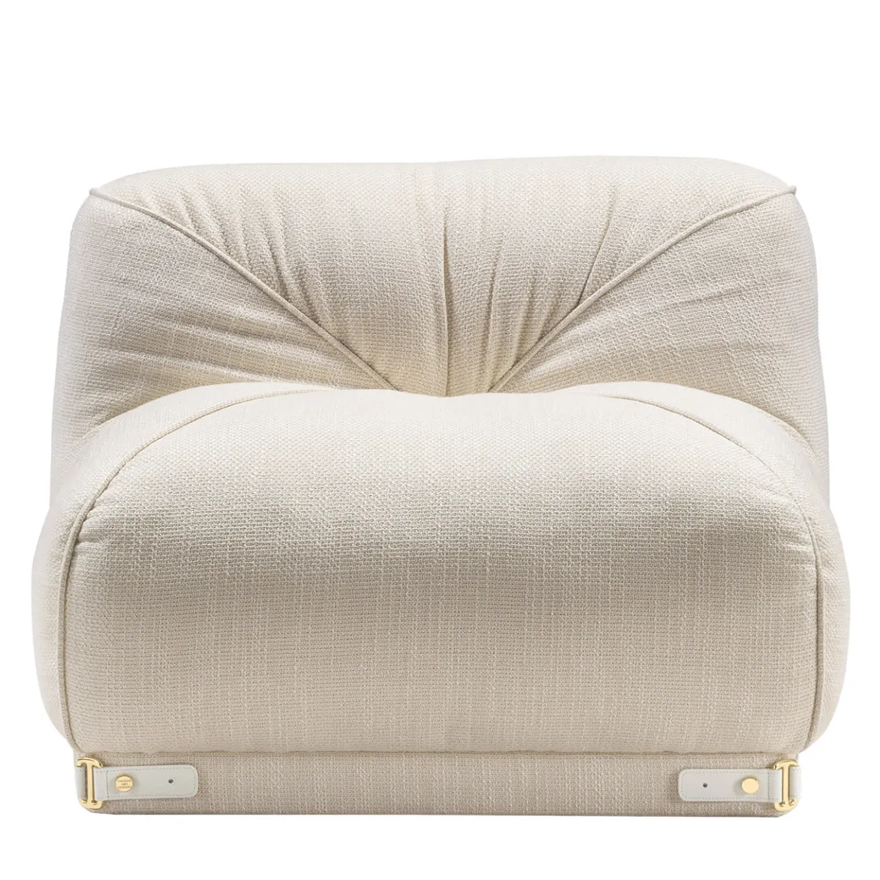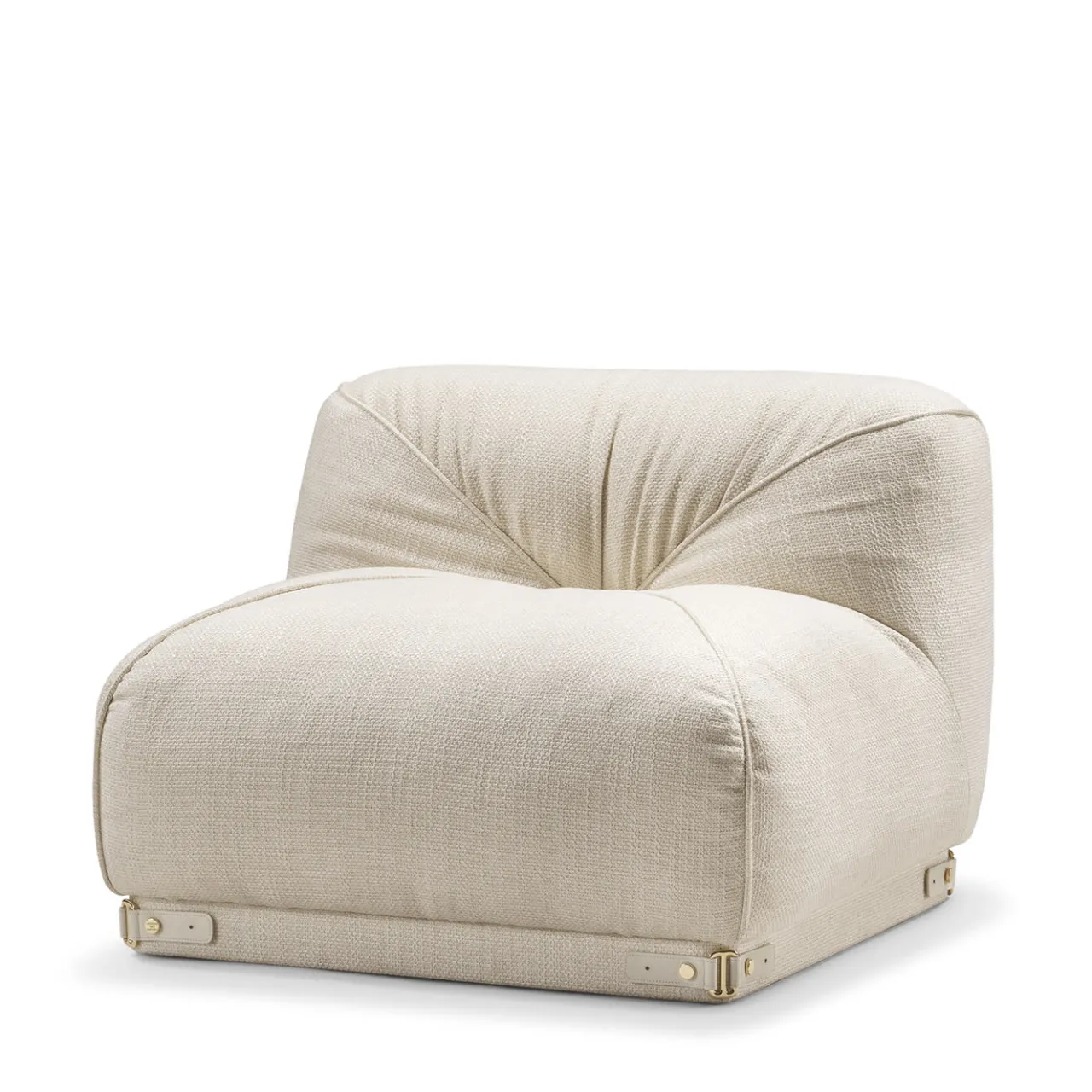 Un divano modulare composto da due elementi di base che si uniscono con una cintura caratterizzata da una fibbia in ottone. La seduta è profonda e confortevole, con curve morbide e ampie.