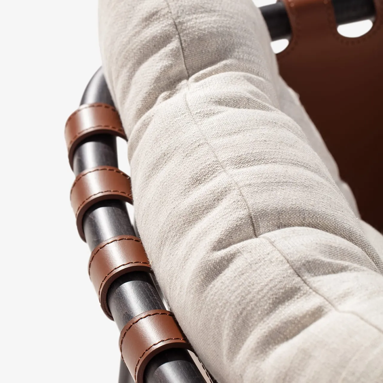 La poltrona Bridge unisce la pelle lavorata a mano con una struttura in legno tubolare e morbidi cuscini in tessuto per un mix armonioso di materiali e texture. In equilibrio tra forma, funzione e comfort, il suo design invitante si adatta a una vasta gamma di stili di interni. La personalizzazione è disponibile, per maggiori informazioni contattare il concierge.