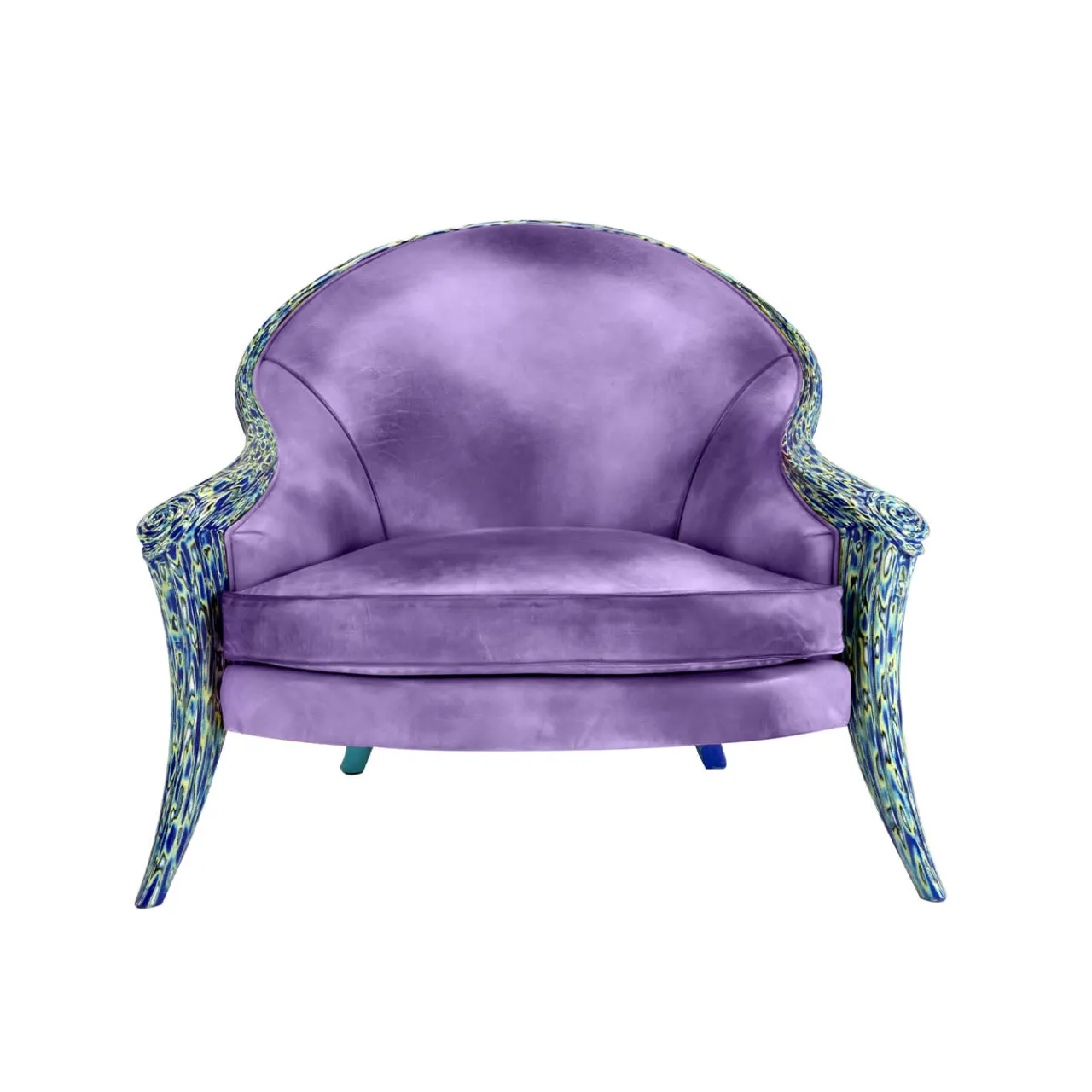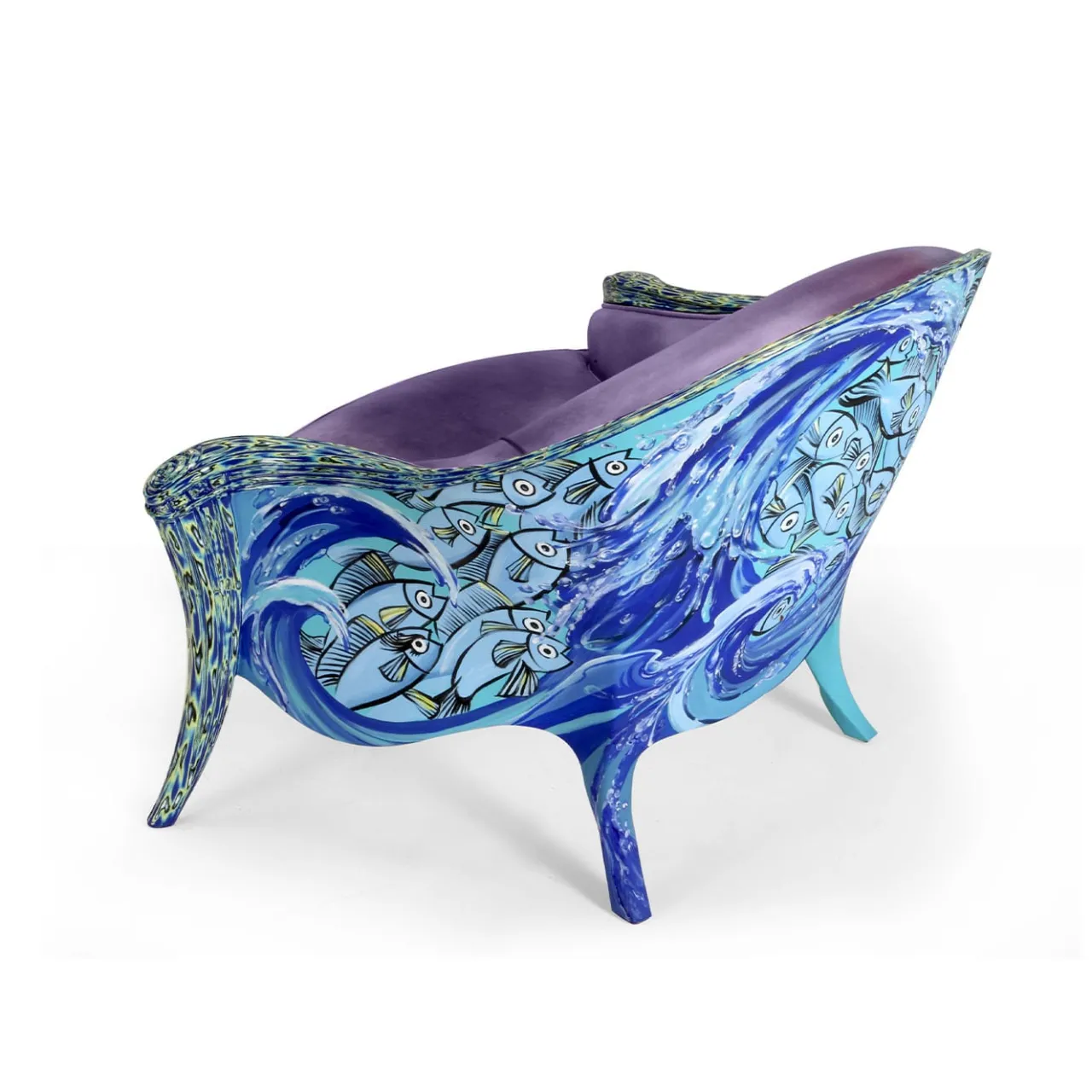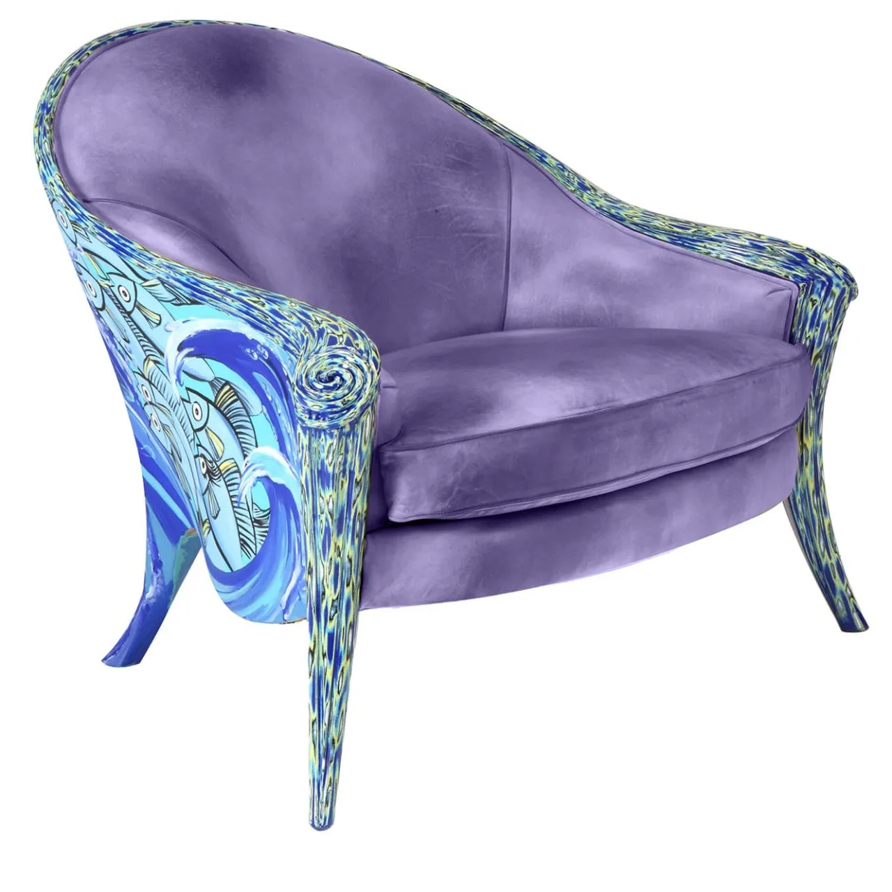 Questa poltrona divertente e al tempo stesso elegante è piena di colori. La struttura in legno intagliato, interamente dipinta a mano con volute di blu e oro, conferisce a questo pezzo lo schienale e i braccioli bassi e le gambe leggermente ricurve. Lo schienale e il cuscino della seduta sono rivestiti in pelle con una finitura multicolore, per un pezzo che si inserisce in qualsiasi ambiente.