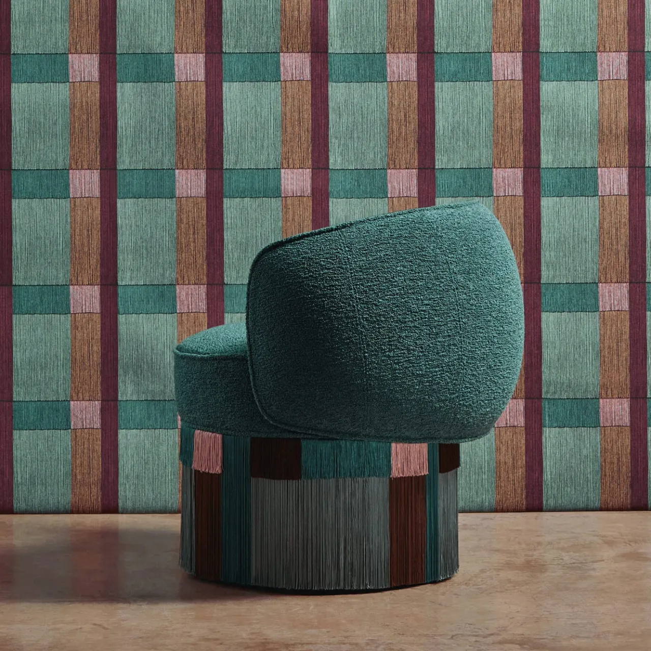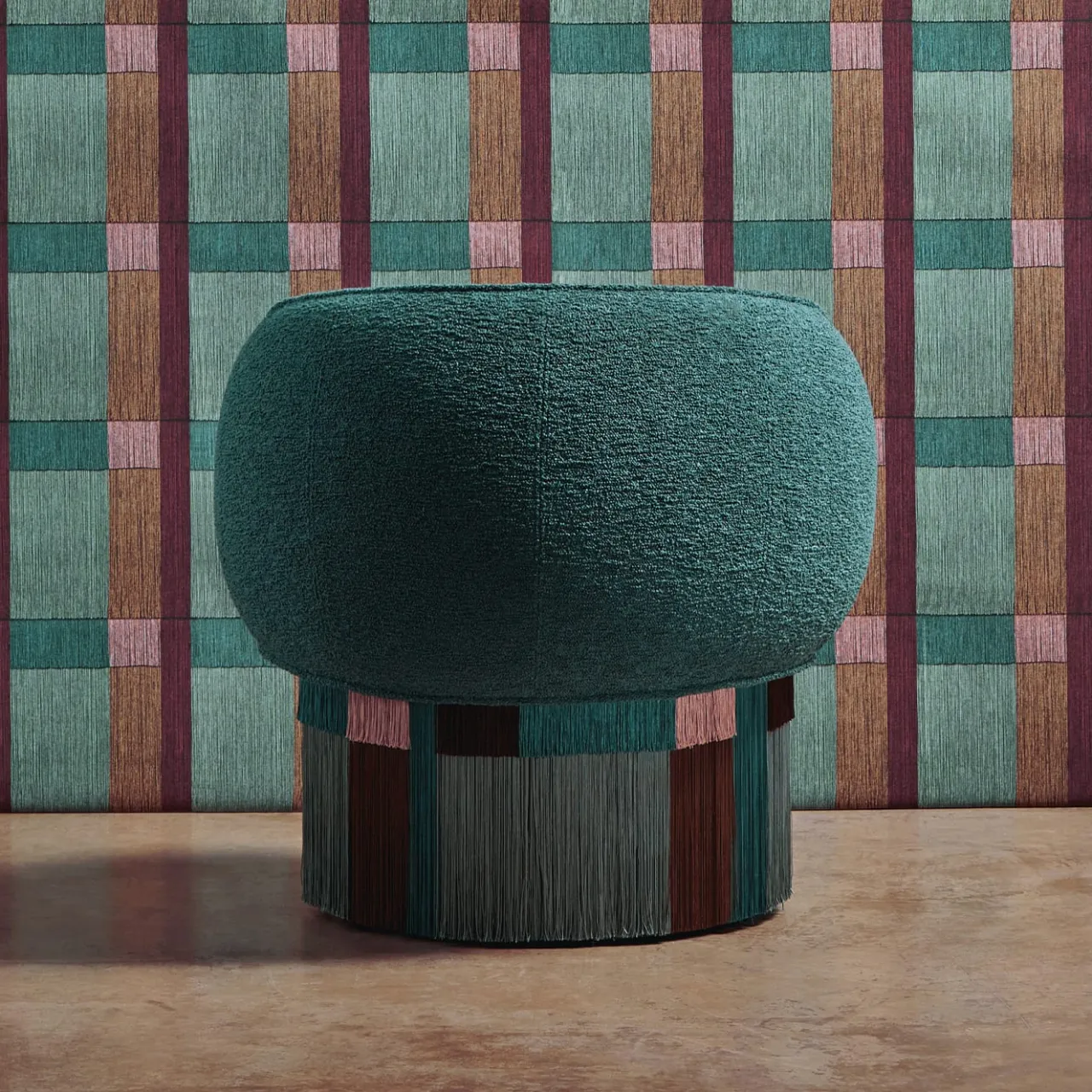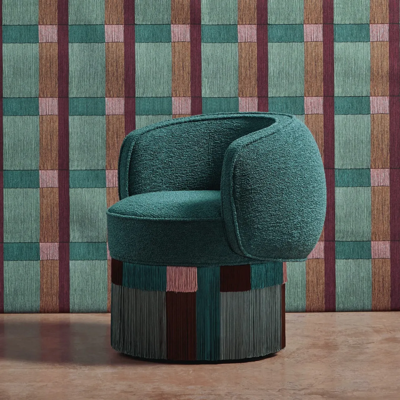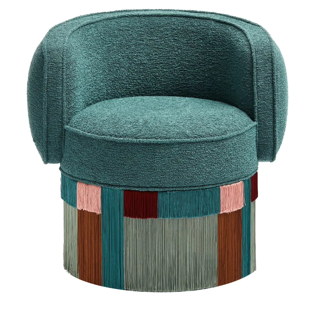 Per un tocco accattivante in una zona giorno contemporanea, questa splendida poltrona Pirouette Clou di Lorenza Bozzoli, realizzata a mano, è dotata di una base girevole in metallo e di una seduta imbottita e rivestita di verde. Impreziosita da una gonna a frange a motivi geometrici con sfumature di verde, marrone e rosa, questo pezzo unico è numerato e firmato dalla designer. La personalizzazione è disponibile, per informazioni contattare il Concierge.
