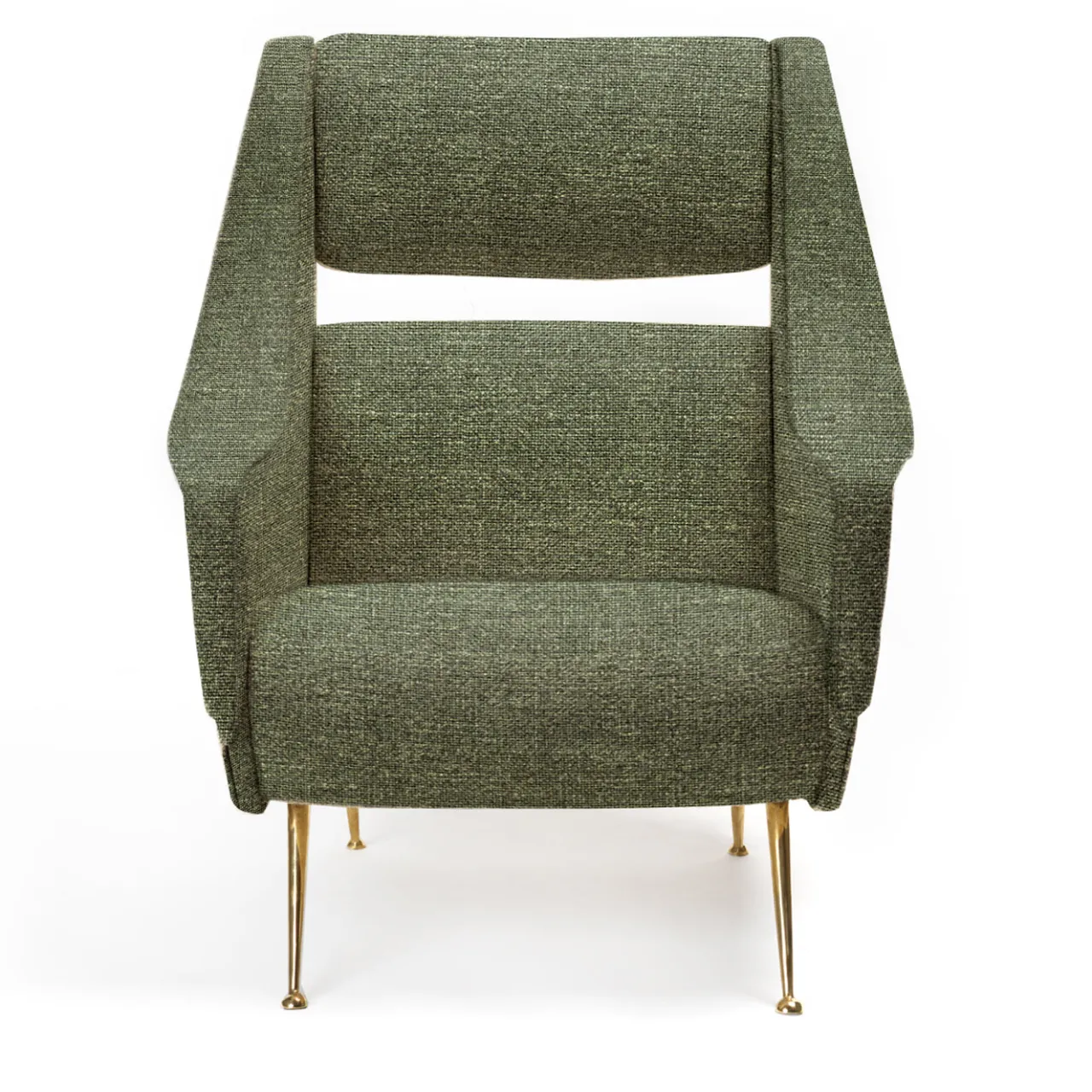 Caratterizzata da linee eleganti ed essenziali e da un carattere deciso, questa poltrona sarà il complemento perfetto per un interno minimalista. Poggiata su piedini metallici sottili e inclinati e rivestita in morbido tessuto color crema, la sua silhouette capiente è caratterizzata da uno schienale semiaperto e da braccioli dritti.