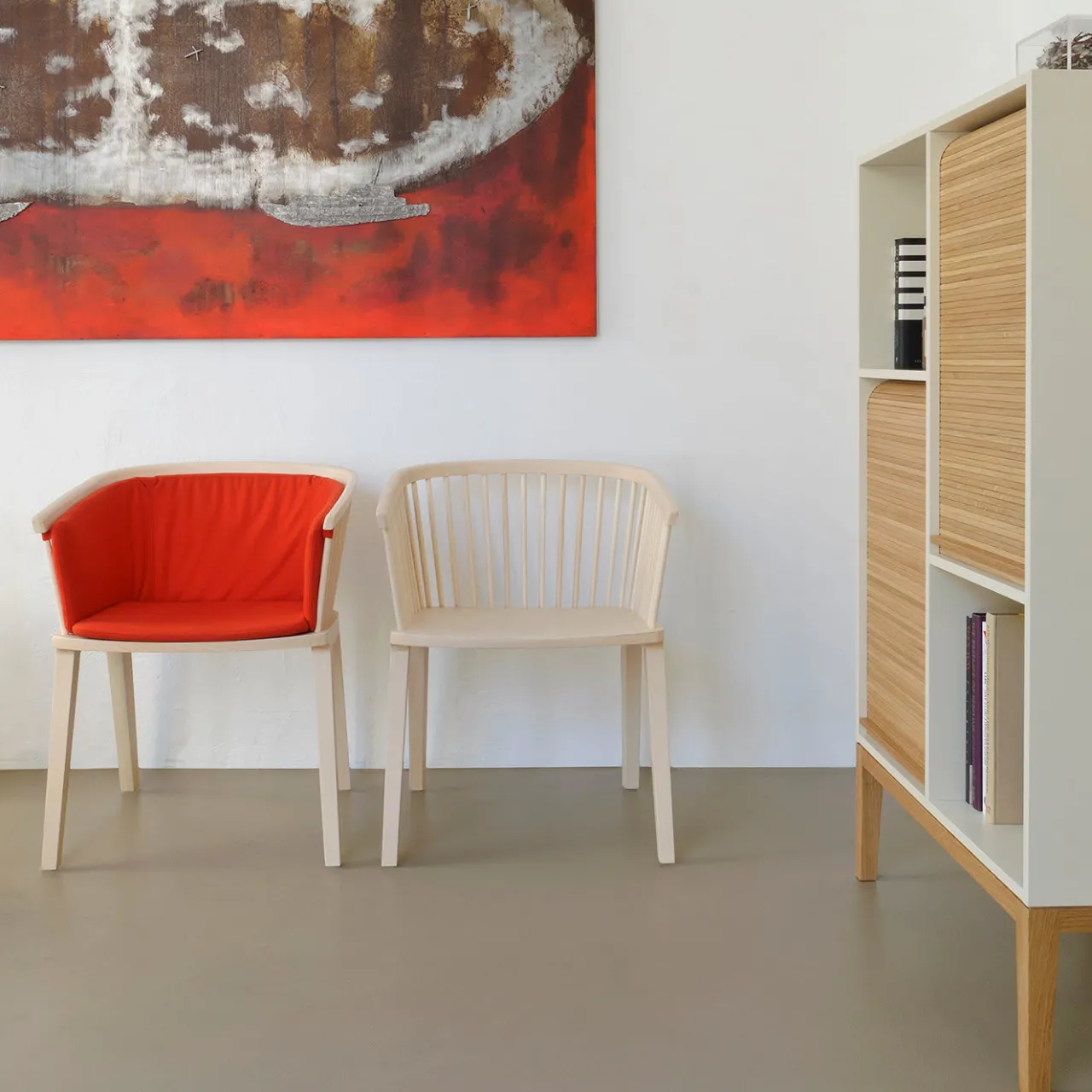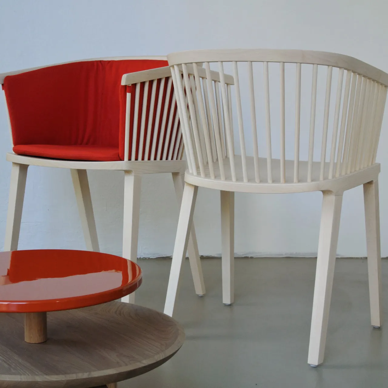 Disegnata da Lorenz+Kaz, questa sedia moderna e tradizionale può essere una sedia da tavolo, elegante e informale allo stesso tempo. Progettata sulla base di un chiaro brief: “creare una poltrona industriale dal gusto artigianale, ispirata alla tradizionale sedia inglese Winsor”. La complessa struttura, soprattutto nello schienale, è composta da aste ad incastro inserite nella base. Il cuscino imbottito è proposto in feltro arancione Nord Wool. Disponibile in faggio massiccio o laccato opaco in bianco o nero.
