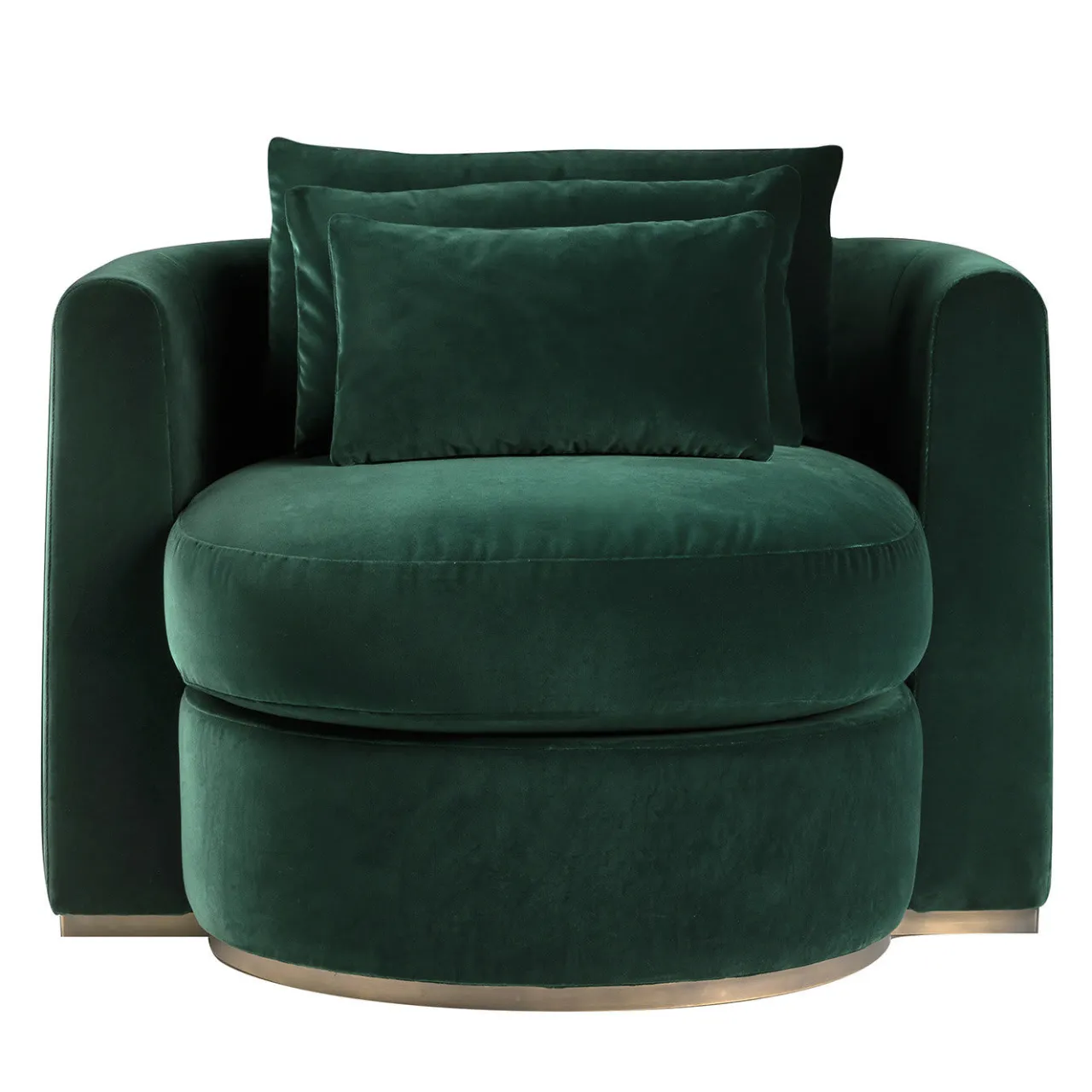 Emana l’allure senza tempo dei mobili sofisticati, questa poltrona sembra invitare a sdraiarsi tra le sue braccia lasciando vagare i pensieri pesanti. La robusta struttura in legno poggia su una base rotonda in bronzo, mentre la seduta cilindrica è completamente avvolta dallo schienale curvo per delineare un angolo intimo dove sedersi. Un rivestimento in tessuto color smeraldo completa il design.