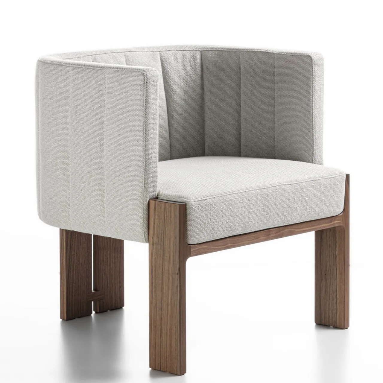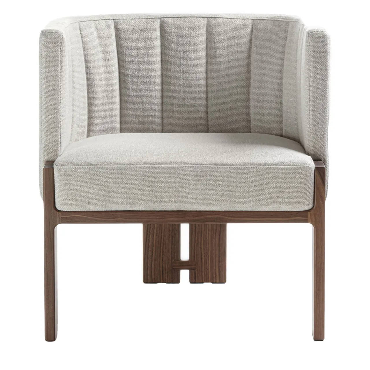 Accogliente e luminosa, questa poltrona compatta è un design esclusivo in cui i contrasti convivono armoniosamente. Il rigore della base in noce canaletto è contrastato dalla curva drammatica che traccia la scocca imbottita e completamente avvolgente, mentre una delicata texture trapuntata ravviva il rivestimento in tessuto bianco per una dichiarazione di sobria eleganza. Per la versione della sedia, contattare il Concierge.