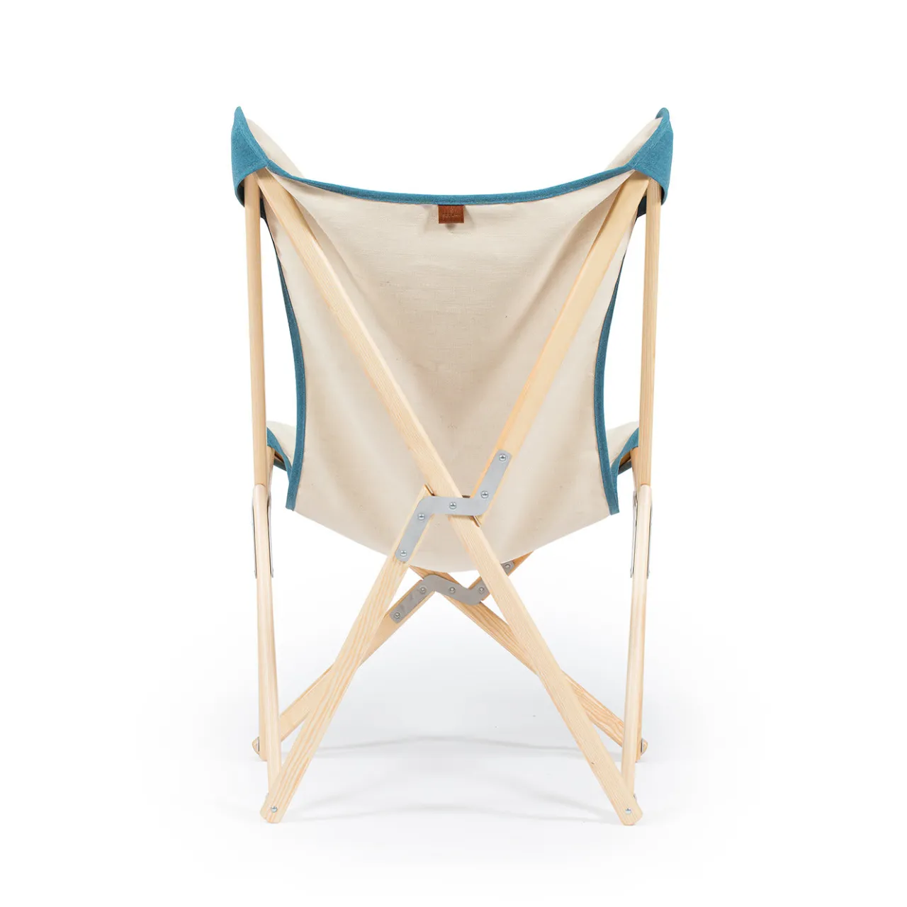 Questa splendida poltrona è un’interpretazione moderna dell’iconica sedia Tripolina utilizzata dalle truppe militari italiane in Libia. Grazie al suo meccanismo pieghevole, alla comoda seduta e alla sorprendente combinazione di colori, questo pezzo è un’aggiunta pratica ed elegante a un interno rustico-chic o contemporaneo. La struttura è realizzata a mano utilizzando il più pregiato frassino massiccio con una finitura naturale che completa splendidamente la seduta/schienale in tessuto color crema (50% cotone e 50% juta) con un orlo in blu-verde realizzato in tessuto 80% acrilico e 20% cotone.