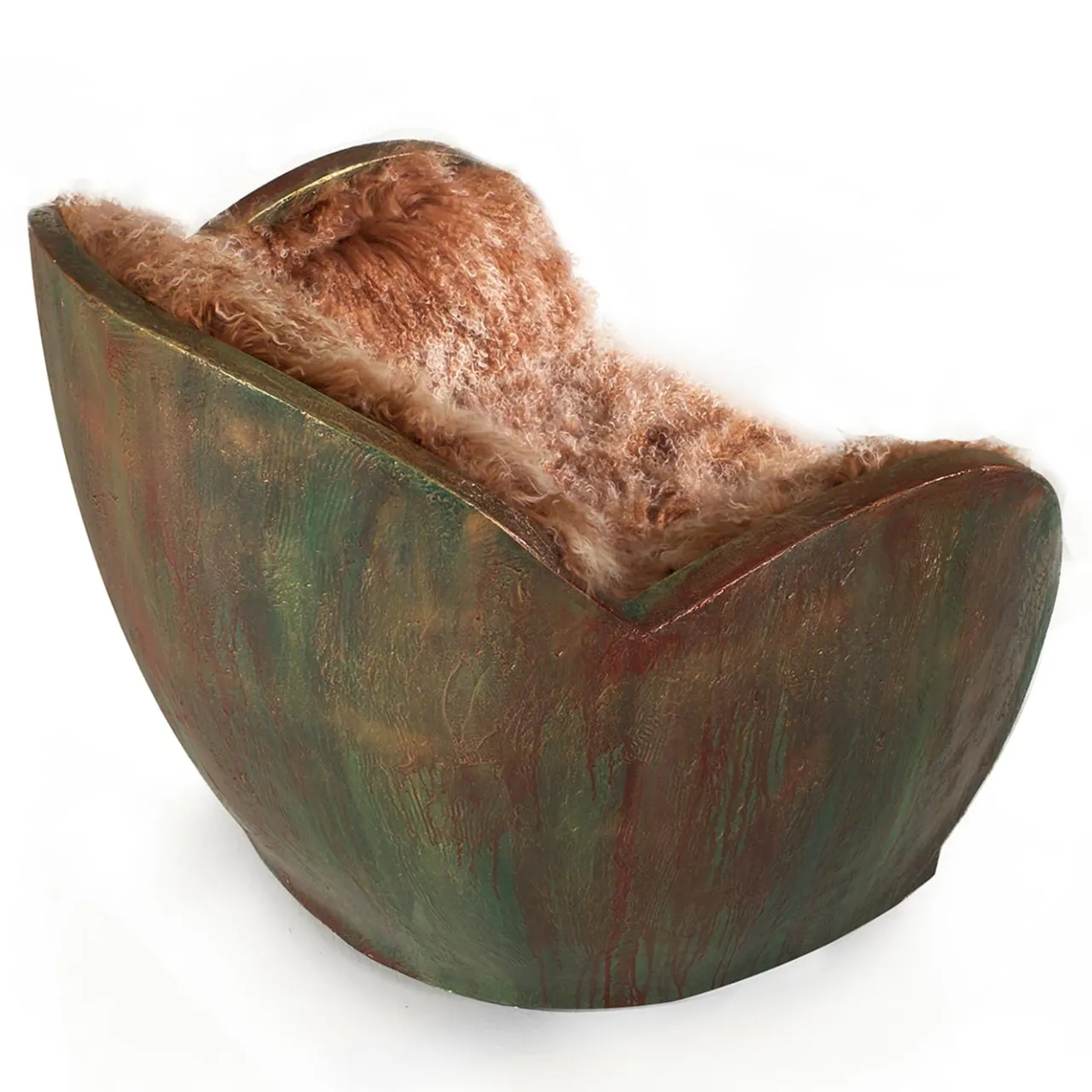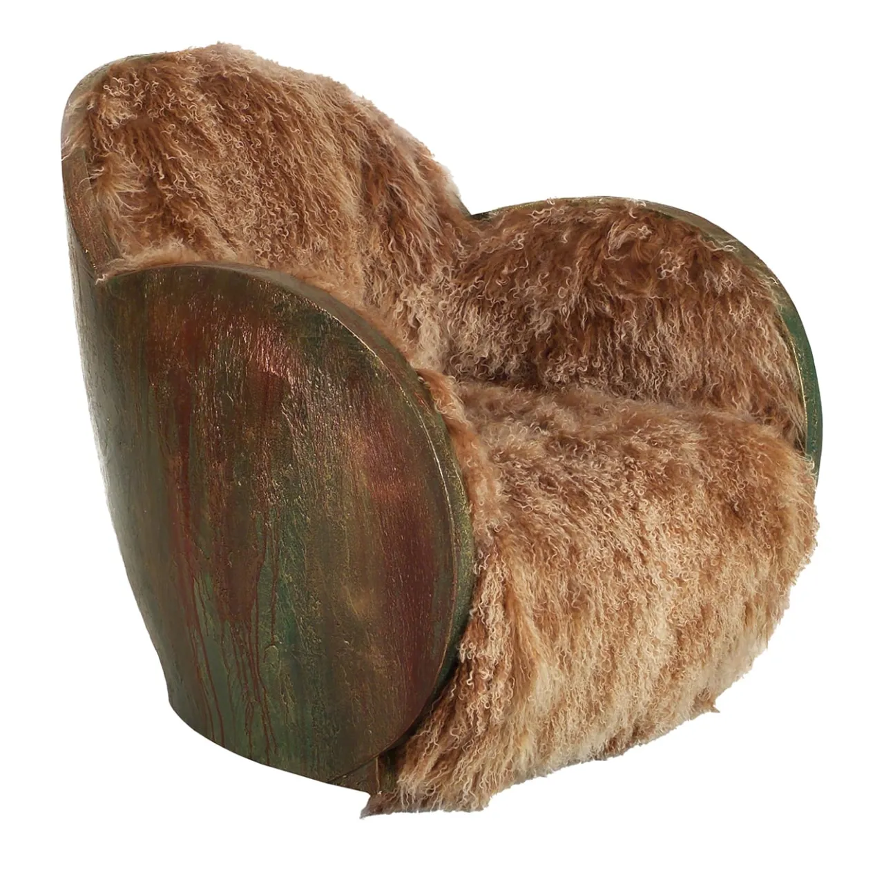 Poltrona girevole dall’accogliente forma a uovo. La poltrona è composta da uno schienale in legno con una finitura materica che ricorda la corteccia di un albero e arricchita da un rivestimento in pelliccia “mongola”.