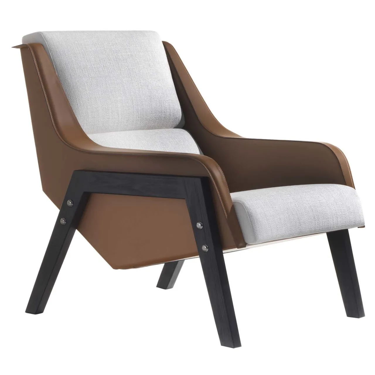 L’intrigante struttura di questa poltrona scultorea nasce dalla combinazione di elementi audaci, caratterizzati da colori e silhouette distintivi. Le gambe in frassino tinto nero incorniciano la linea fratturata formata dai cuscini di seduta, schienale e poggiatesta in tessuto grigio, affiancati da braccioli rivestiti in pelle marrone chiaro.