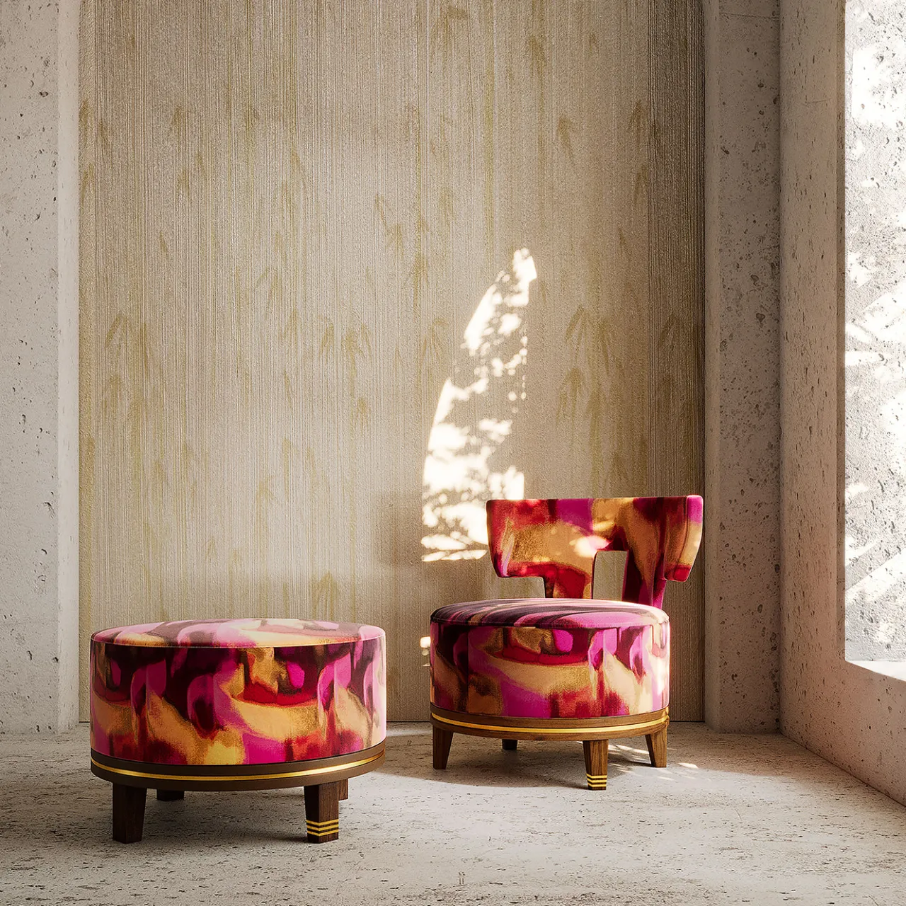 La poltrona lounge rotonda Charles K presenta forme moderne e arrotondate con uno schienale curvo e un sedile profondo progettato per il comfort. La sua base e le sue gambe in legno mostrano sottili dettagli lineari dorati che ne esaltano l’eleganza. Rivestita in tessuto jacquard Reimei Red 156, la poltrona presenta un motivo dinamico ispirato ai colori cangianti dell’Aurora Boreale. Il pezzo è presentato in legno di noce americano, fondendo uno stile contemporaneo con dettagli raffinati.