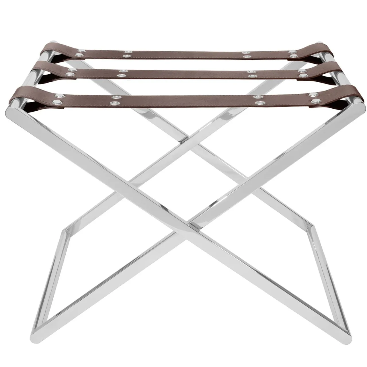 Portabagagli pieghevole con 3 cinghie in pelle. Gambe in metallo cromato o dorato regolabili in altezza.
